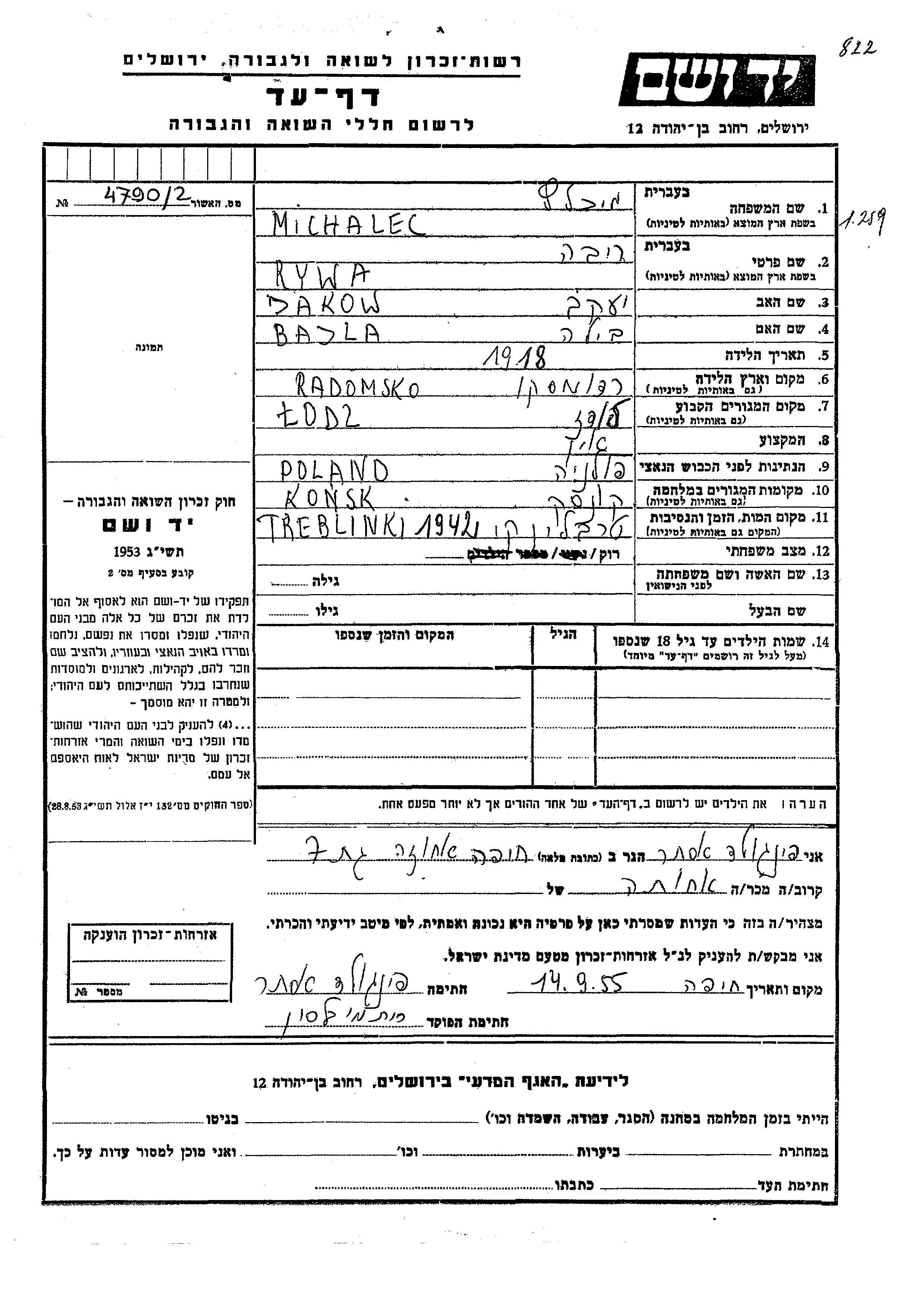 Rywa Michalec wurde im Jahr 1918 in Radomsko, Polen geboren. Sie war die Tochter von Yakow und Bayla. Sie war Ledig. Vor dem Zweiten Weltkrieg lebte sie in Lodz, Polen. Während des Krieges war sie in Konsk, Polen.
