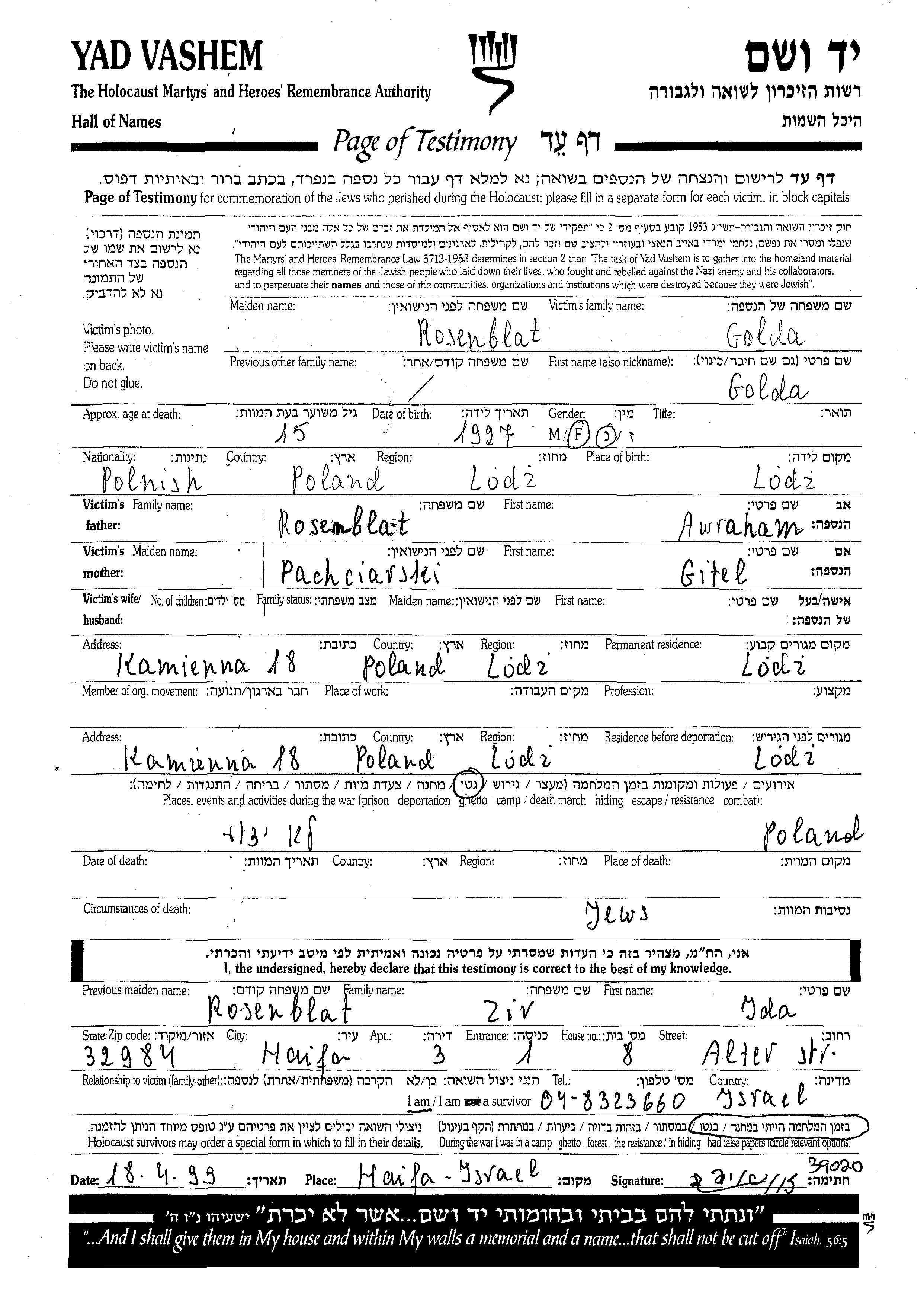 Golda Rosenblat wurde im Jahr 1927 in Lodz, Polen geboren. Sie war die Tochter von Awraham und Gitel, geb. Pachciarski. Vor dem Zweiten Weltkrieg lebte sie in Lodz, Polen. Während des Krieges war sie in Lodz, Polen.