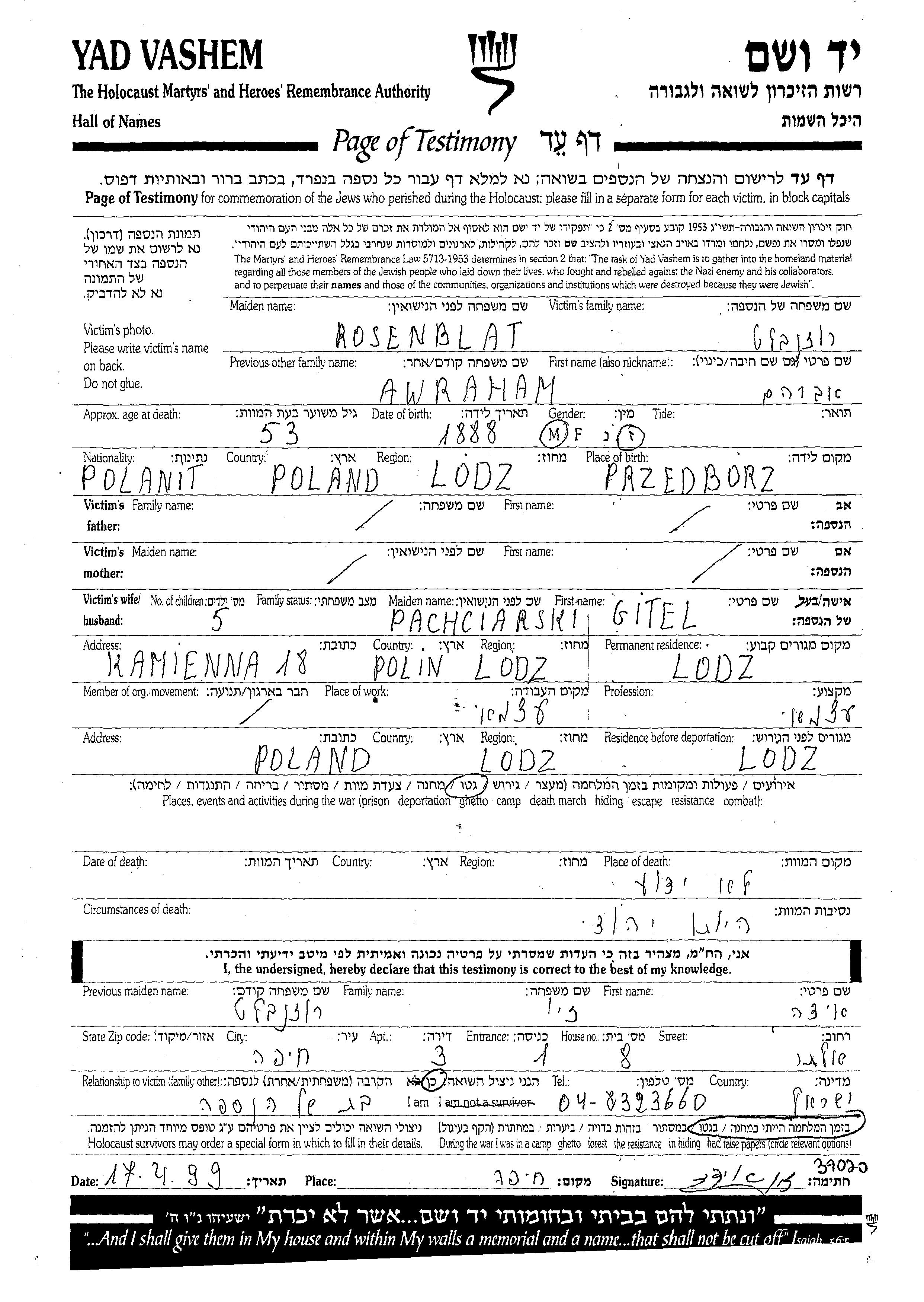 Avraham Rosenblat wurde im Jahr 1888 in Przedborz, Polen geboren. Er war Selbständig und mit Gitel, geb. Pachciarski Verheiratet. Vor dem Zweiten Weltkrieg lebte er in Lodz, Polen. Während des Krieges war er in Lodz, Polen.