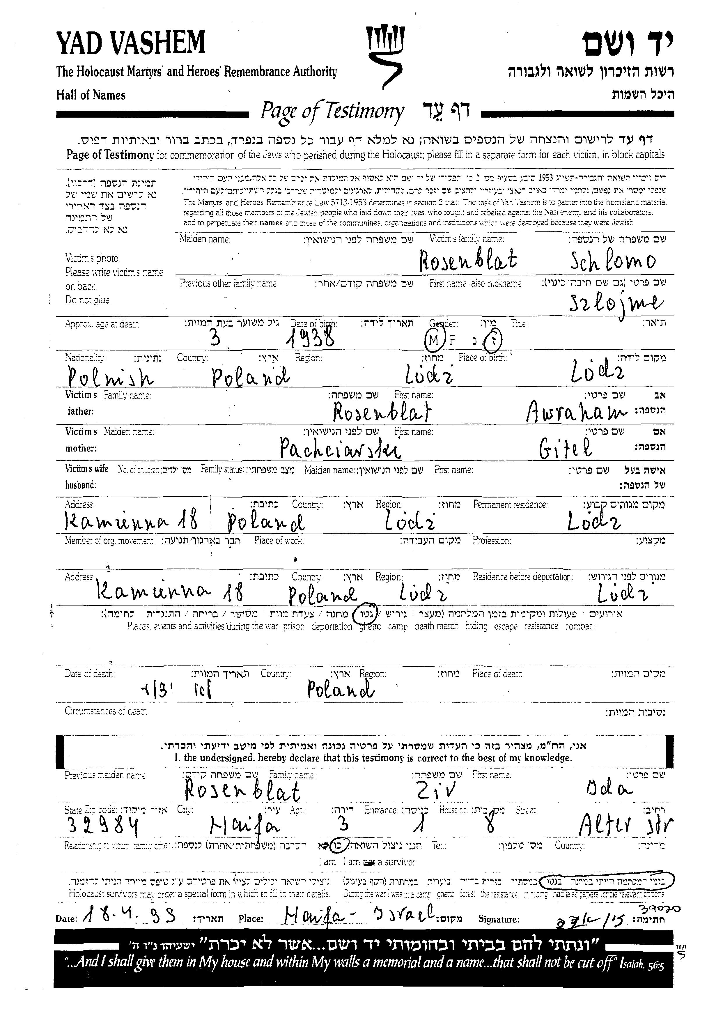 Szlojme Rosenblat wurde im Jahr 1938 in Lodz, Polen geboren. Er war der Sohn von Awraham und Gitel, geb. Pachciarski. Er war Kind. Vor dem Zweiten Weltkrieg lebte er in Lodz, Polen. Während des Krieges war er in Lodz, Polen.