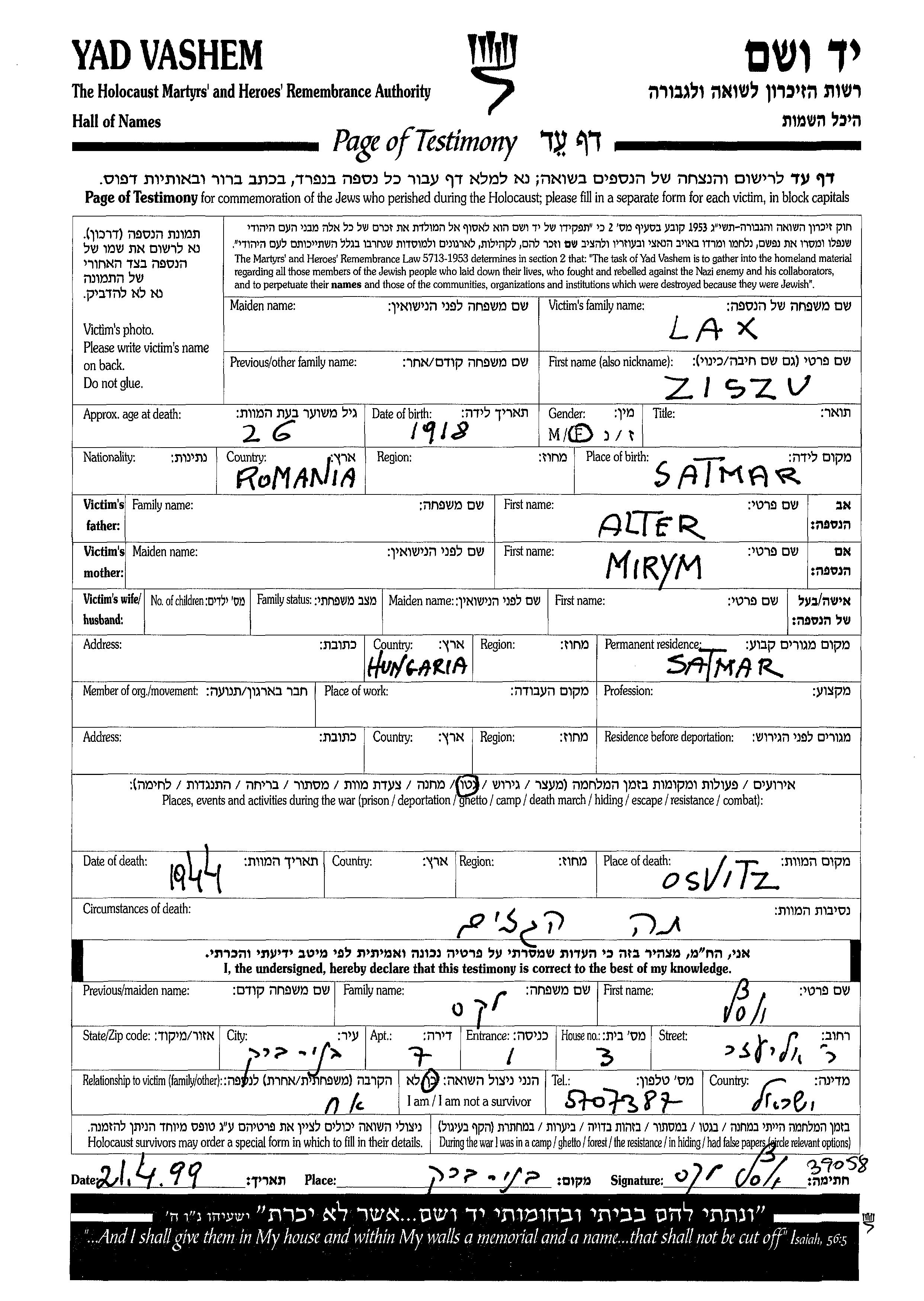 Ziszu wurde in der Schoah ermordet. Todesort: Auschwitz, Polen im Jahr 1944.