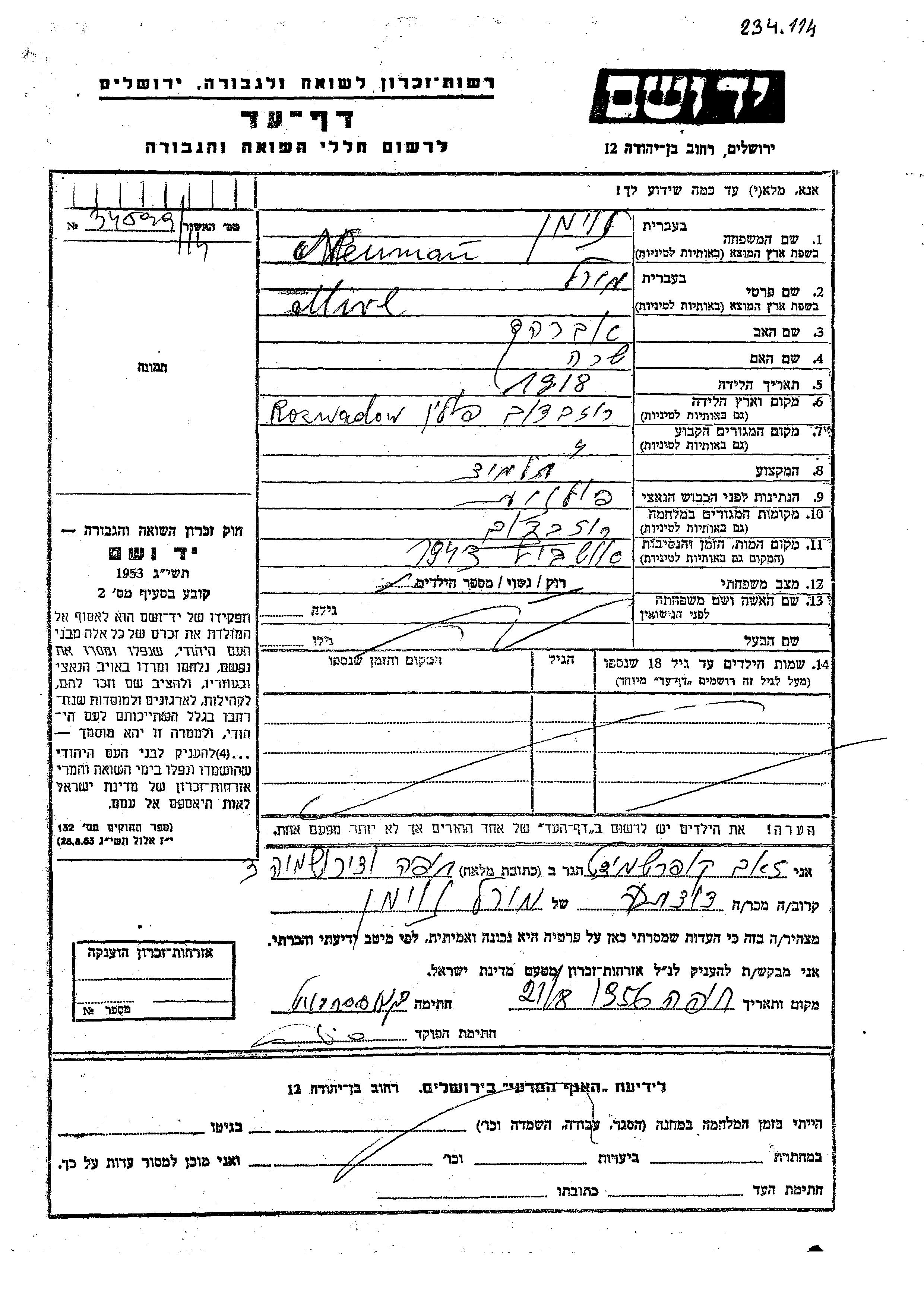 Mirl Neuman wurde im Jahr 1918 in Rozwadów, Polen geboren. Sie war die Tochter von Avraham und Sara. Sie war Schüler/-in und Ledig. Vor dem Zweiten Weltkrieg lebte sie in Rozwadów, Polen. Während des Krieges war sie in Rozwadów, Polen.