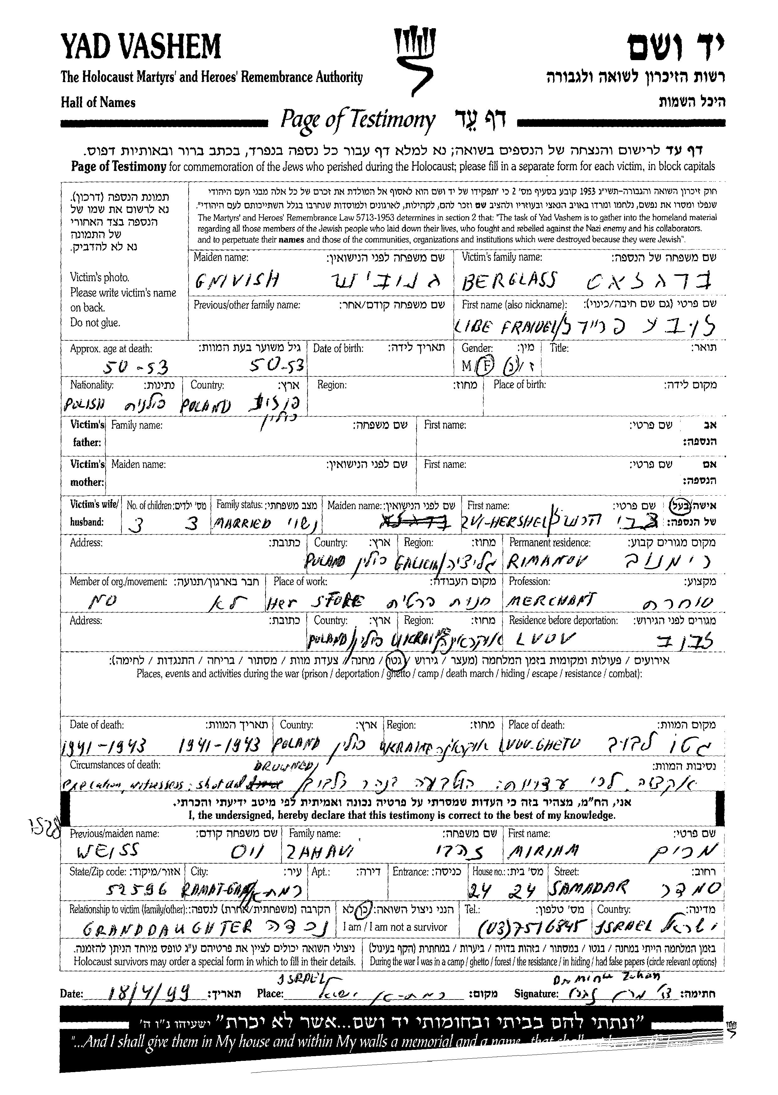 Lube Libe Fraidel Berglass, geb. Gnivish Gnivosh wurde in Polen geboren. Sie war Kaufmann/-frau und mit Tzvi, geb. Hershel Verheiratet. Vor dem Zweiten Weltkrieg lebte sie in Rymanow, Polen. Während des Krieges war sie in Lwow, Polen.