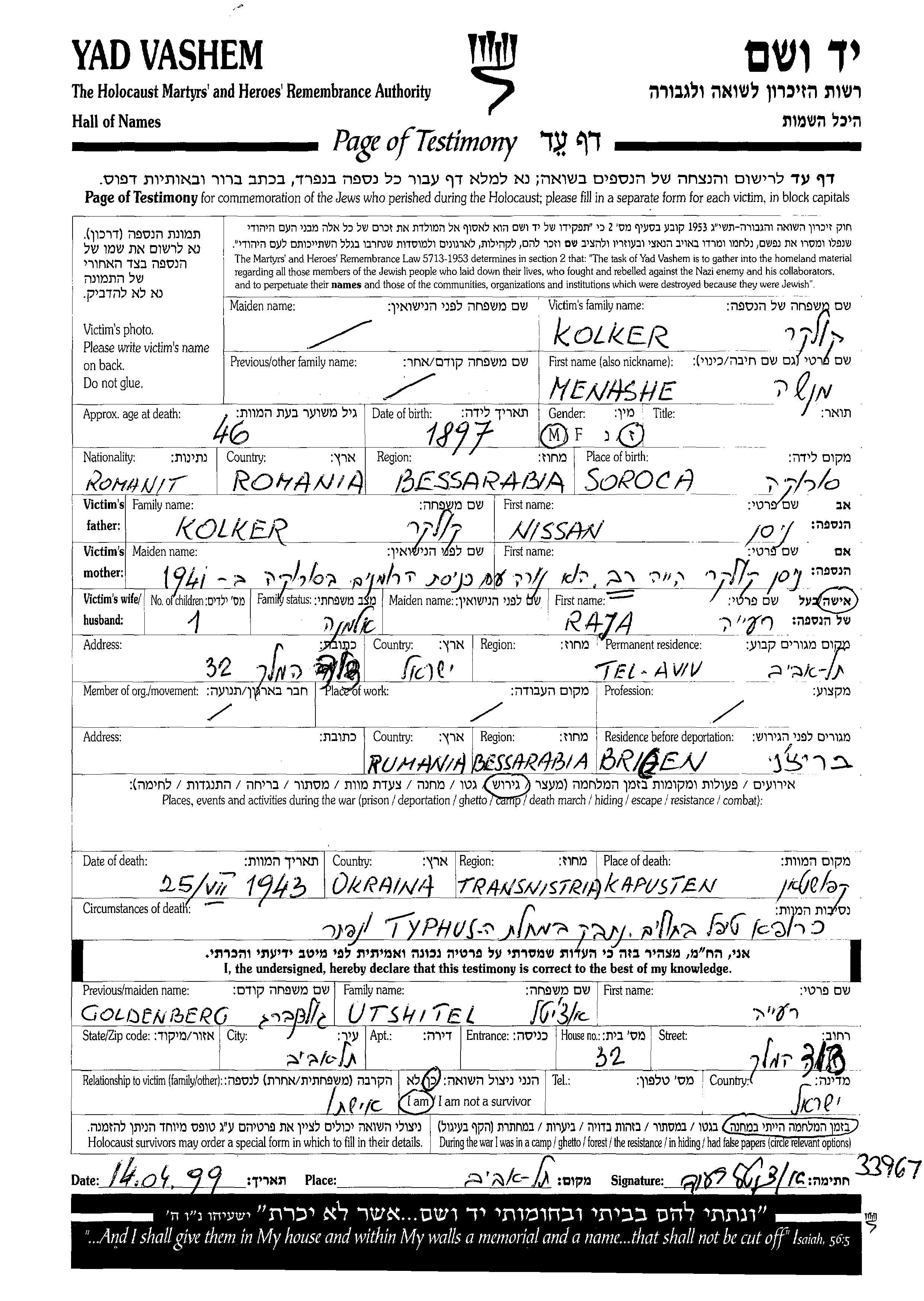 Menashe Kolker wurde im Jahr 1897 in Soroca, Rumänien geboren. Er war der Sohn von Nissan. Er war Arzt/ärztin und mit Raja Verheiratet. Während des Krieges war er in Briceni, Rumänien.