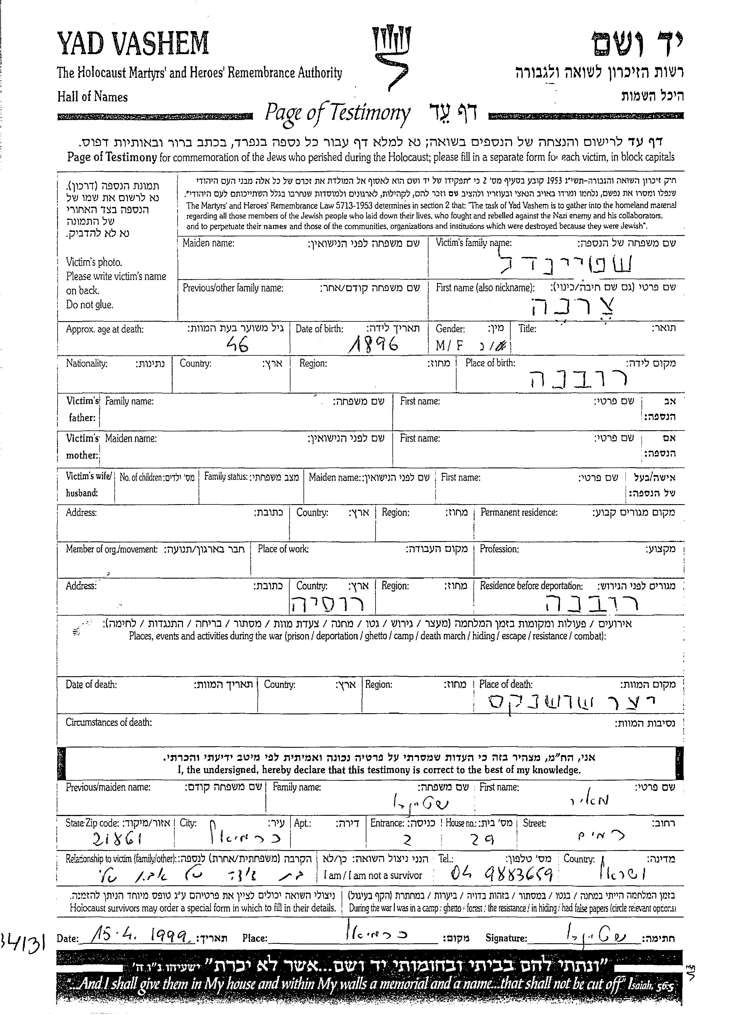 Charna Shteindel wurde im Jahr 1896 in Rowno, Polen geboren. Vor dem Zweiten Weltkrieg lebte sie in Rowno, Polen. Während des Krieges war sie in Rowno, Polen.
