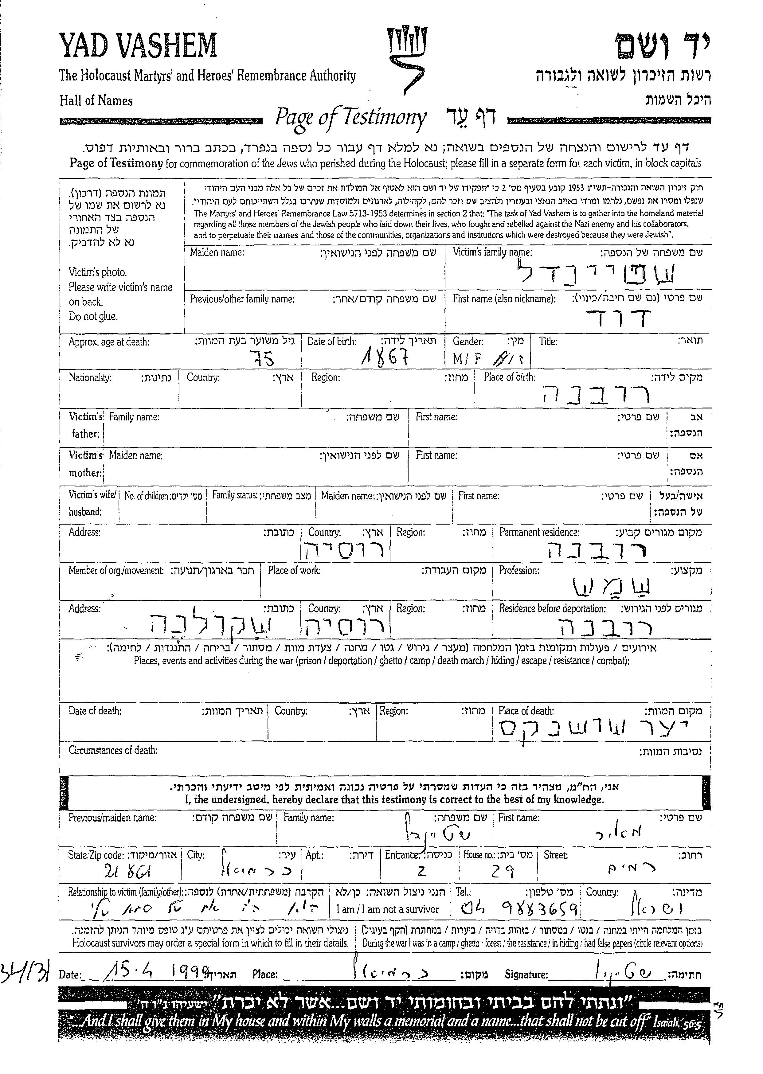David wurde in der Schoah ermordet. Todesort: Sosenki, Polen.