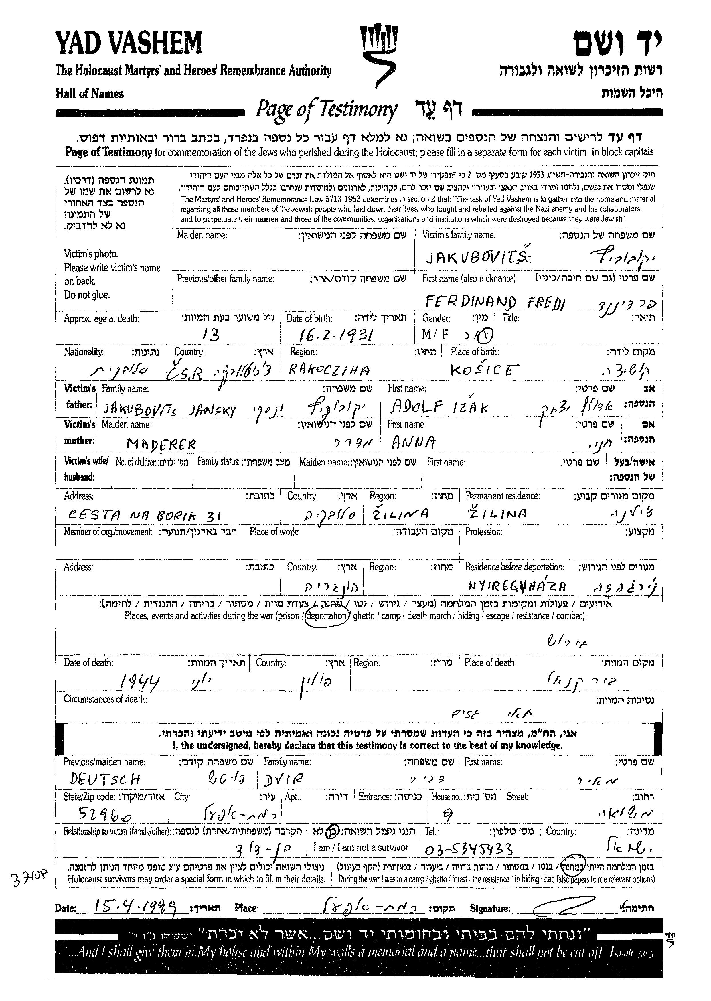 Jakubovits Fredi Ferdinand 1931 Zilina, Tschechoslowakei Gedenkblatt