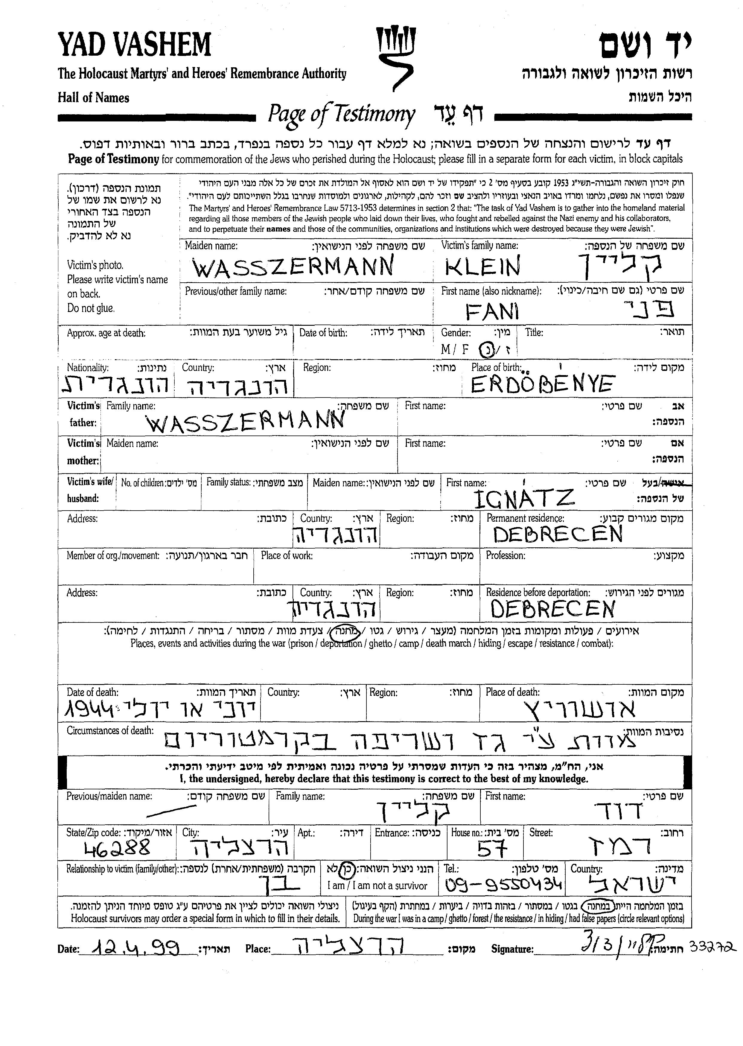 Fani Klein, geb. Wasszermann wurde in Erdobenye, Ungarn geboren. Sie war mit Ignatz Verheiratet. Vor dem Zweiten Weltkrieg lebte sie in Debrecen, Ungarn. Während des Krieges war sie in Debrecen, Ungarn.