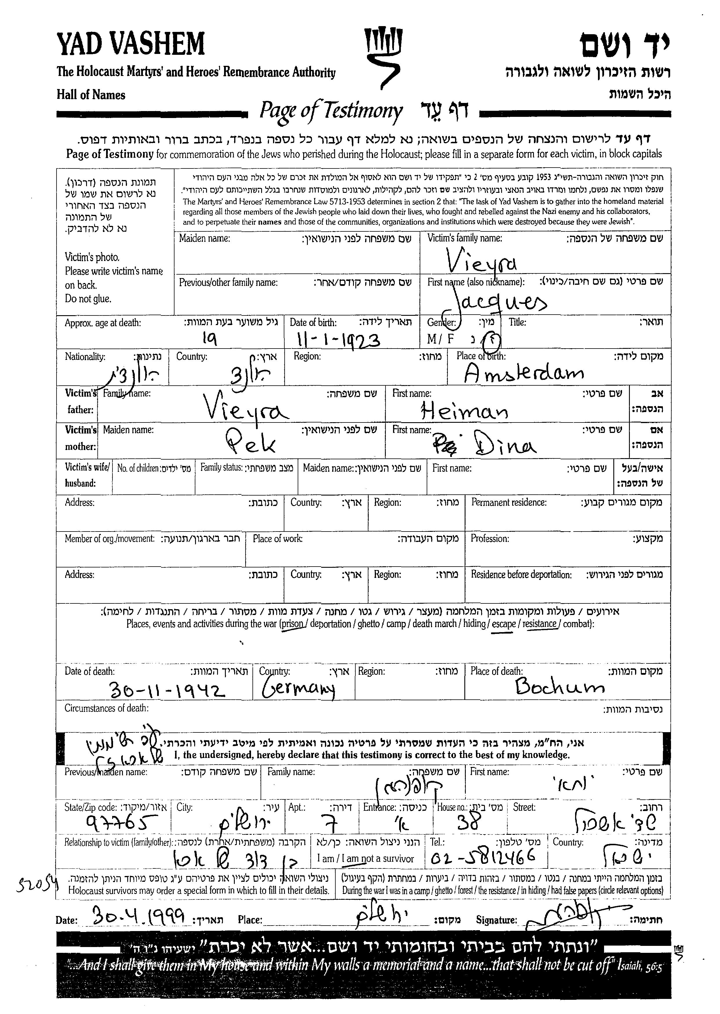 Jacques Vieyra wurde im Jahr 1923 in Amsterdam, Niederlande geboren. Er war der Sohn von Heiman und Dina, geb. Pek. Jacques wurde in der Schoah ermordet. Todesort: Bochum, Deutsches Reich im Jahr 30/11/1942.