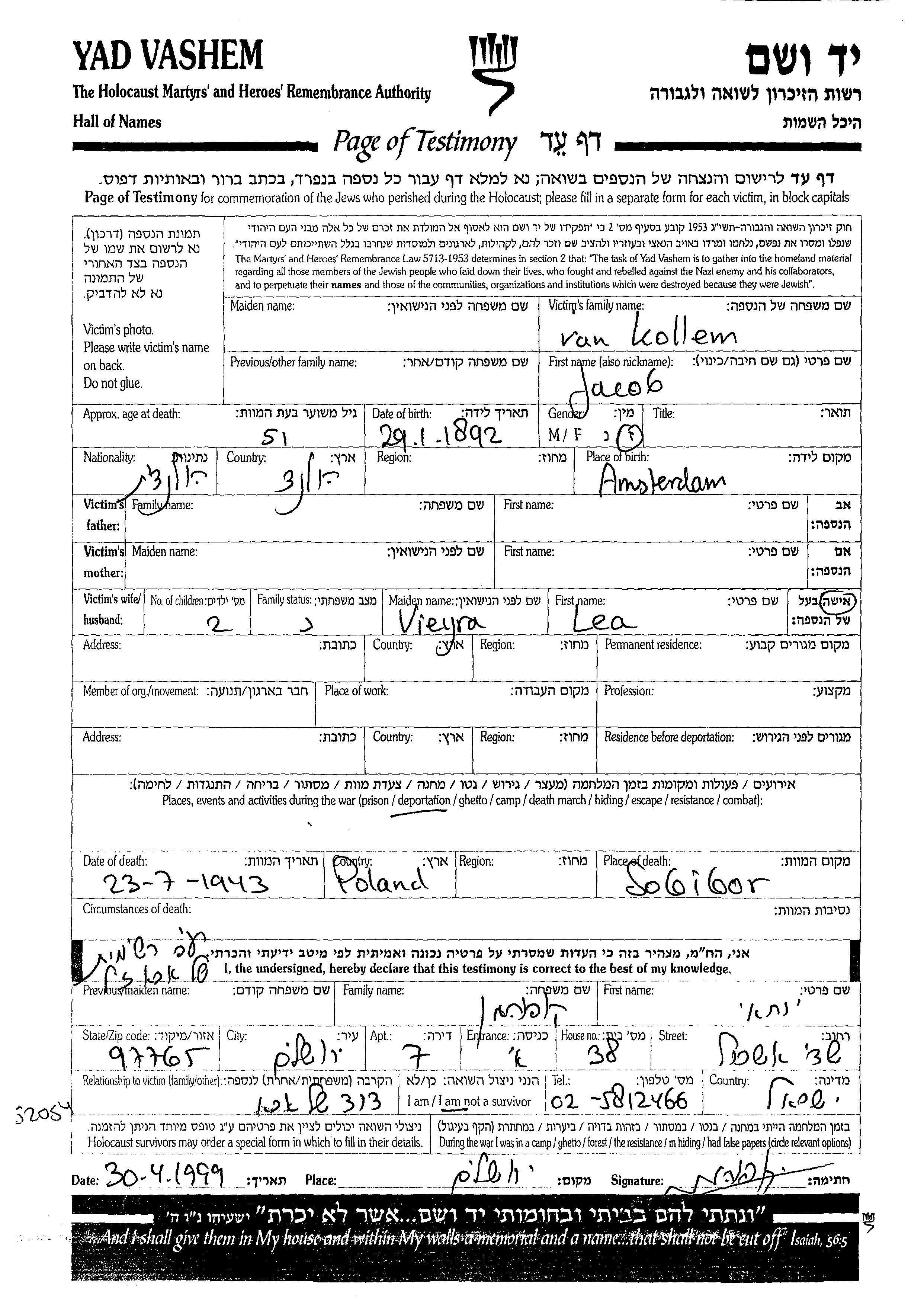 Jacob Kollem van wurde im Jahr 1892 in Amsterdam, Niederlande geboren. Er war mit Lea, geb. Vieyra Verheiratet. Jacob wurde in der Schoah ermordet. Todesort: Sobibor, Polen im Jahr 23/07/1943.