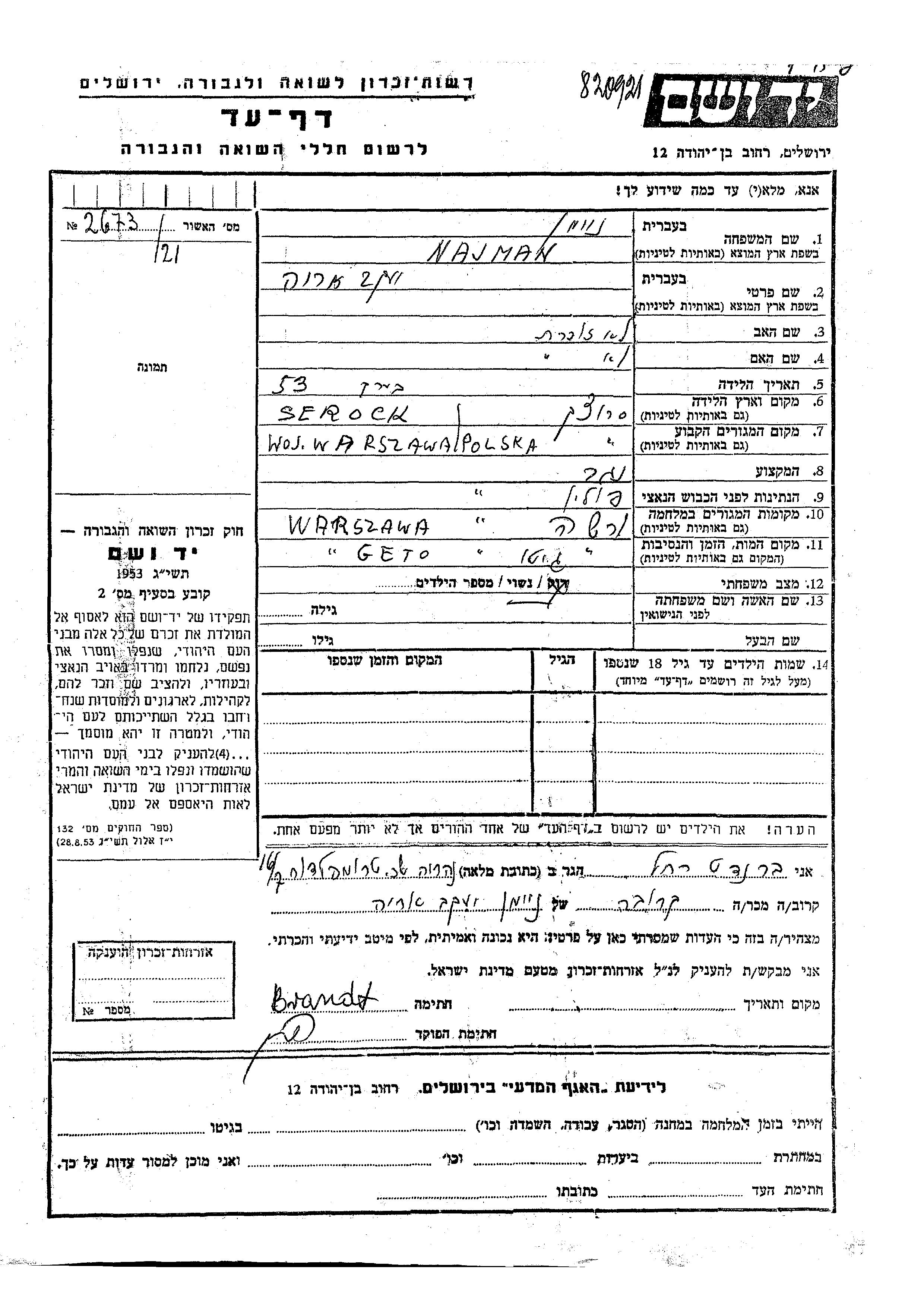 Yaakov Arie Najman wurde in Serock, Polen geboren. Er war Zimmermann und Verheiratet. Vor dem Zweiten Weltkrieg lebte er in Warszawa, Polen. Während des Krieges war er in Warszawa, Polen.