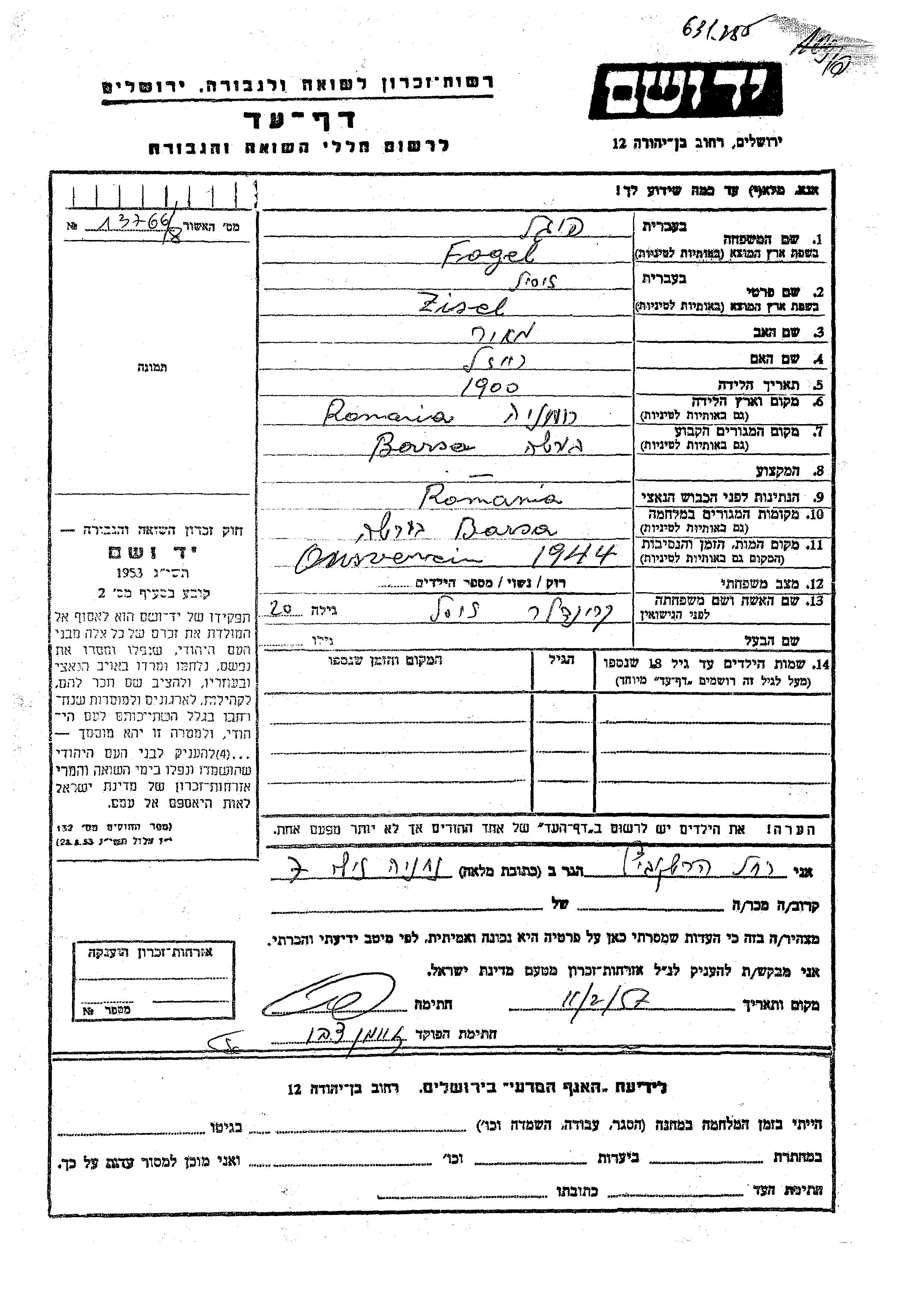 Zisel Zisil Fogel wurde im Jahr 1900 in Rumänien geboren. Er war der Sohn von Meir und Reizl. Er war mit Zysl, geb. Krindler Verheiratet. Vor dem Zweiten Weltkrieg lebte er in Barsa, Rumänien. Während des Krieges war er in Barsa, Rumänien.