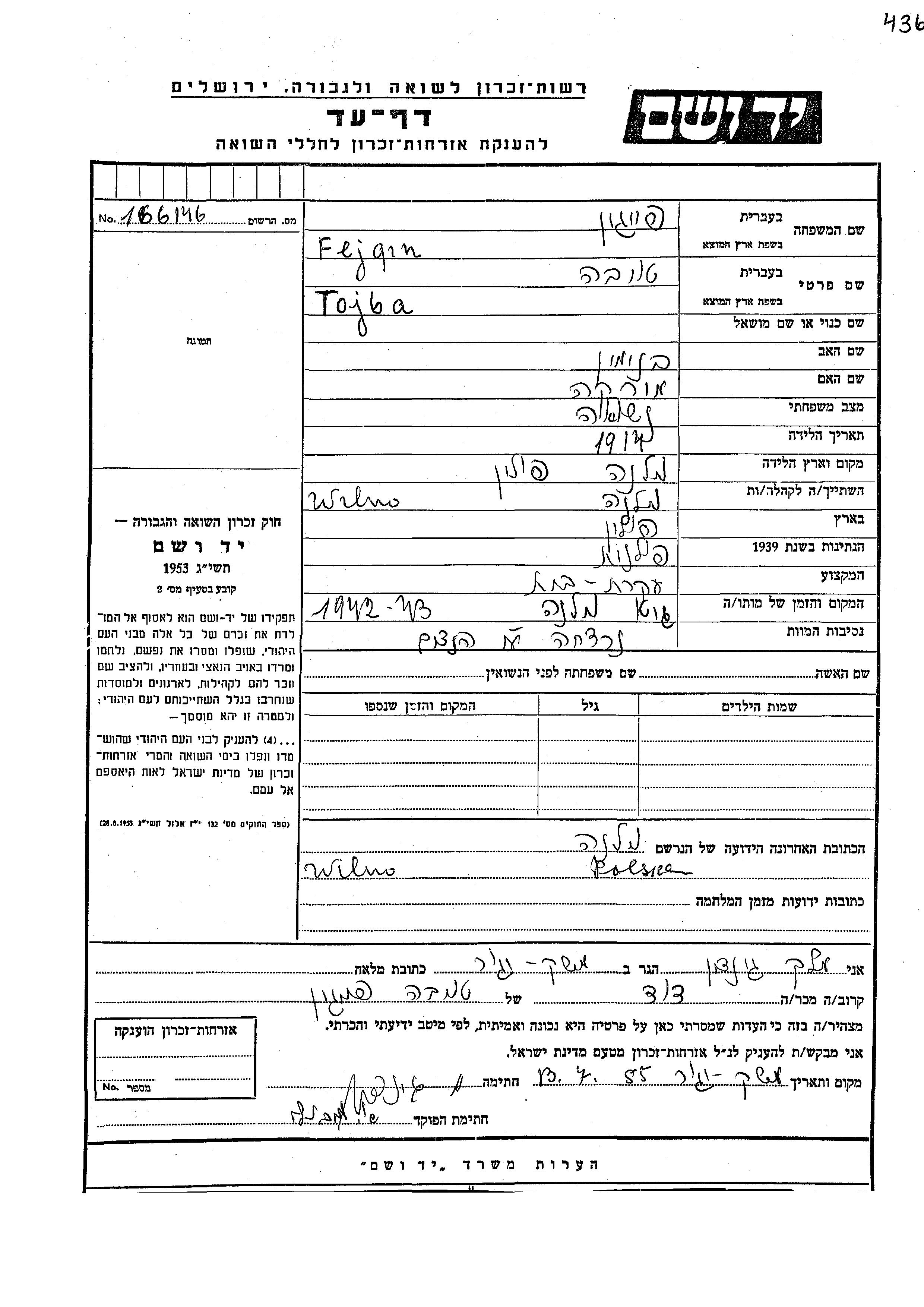 Tojba wurde in der Schoah ermordet. Todesort: Wilno, Polen im Jahr 1942.