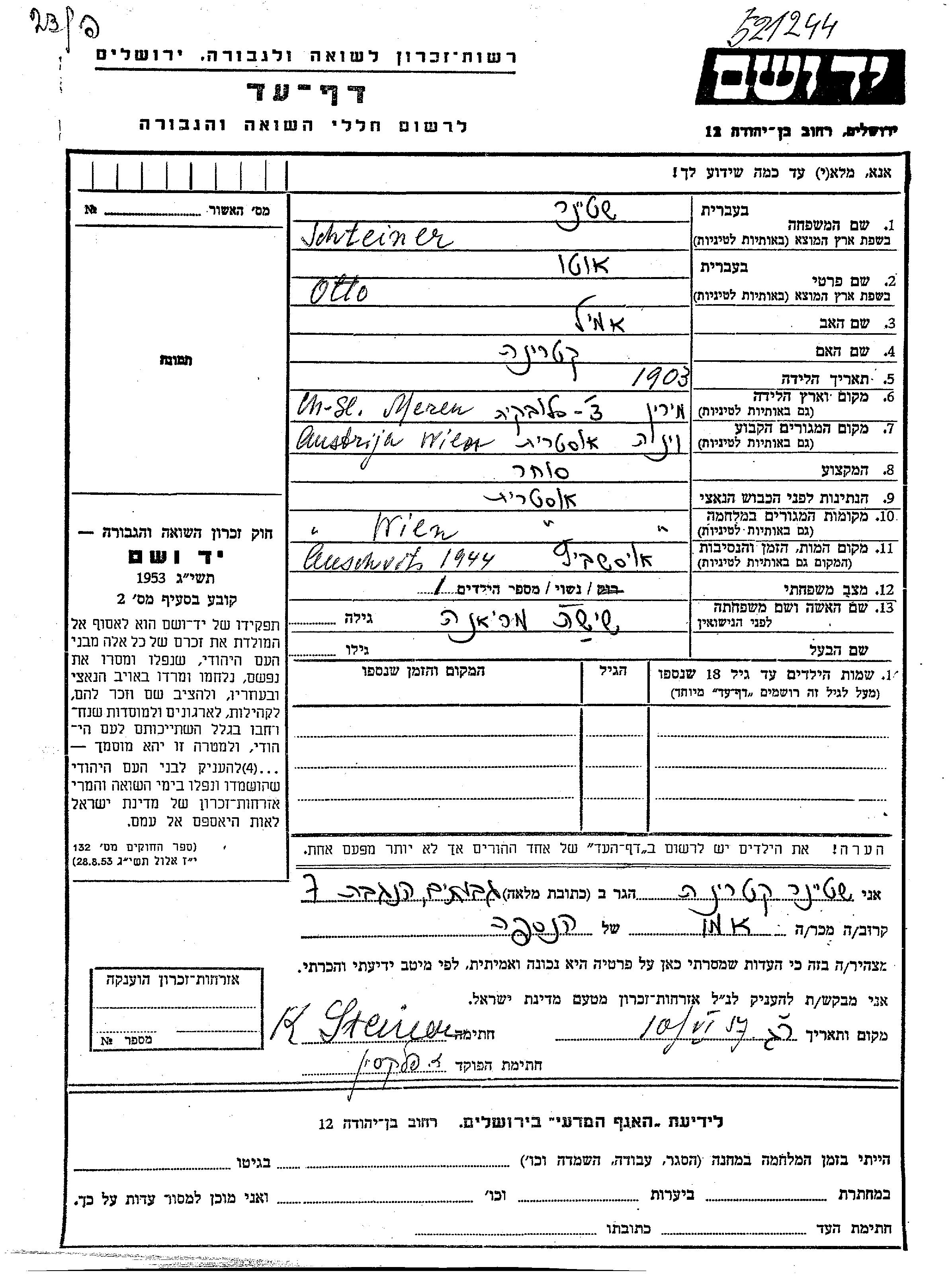 Otto Schteiner wurde im Jahr 1903 in Meren, Rumänien geboren. Er war der Sohn von Emil und Katerina. Er war Kaufmann/-frau und mit Mariana, geb. Shisha Verheiratet. Vor dem Zweiten Weltkrieg lebte er in Wien, Österreich. Während des Krieges war er in Wien, Österreich.