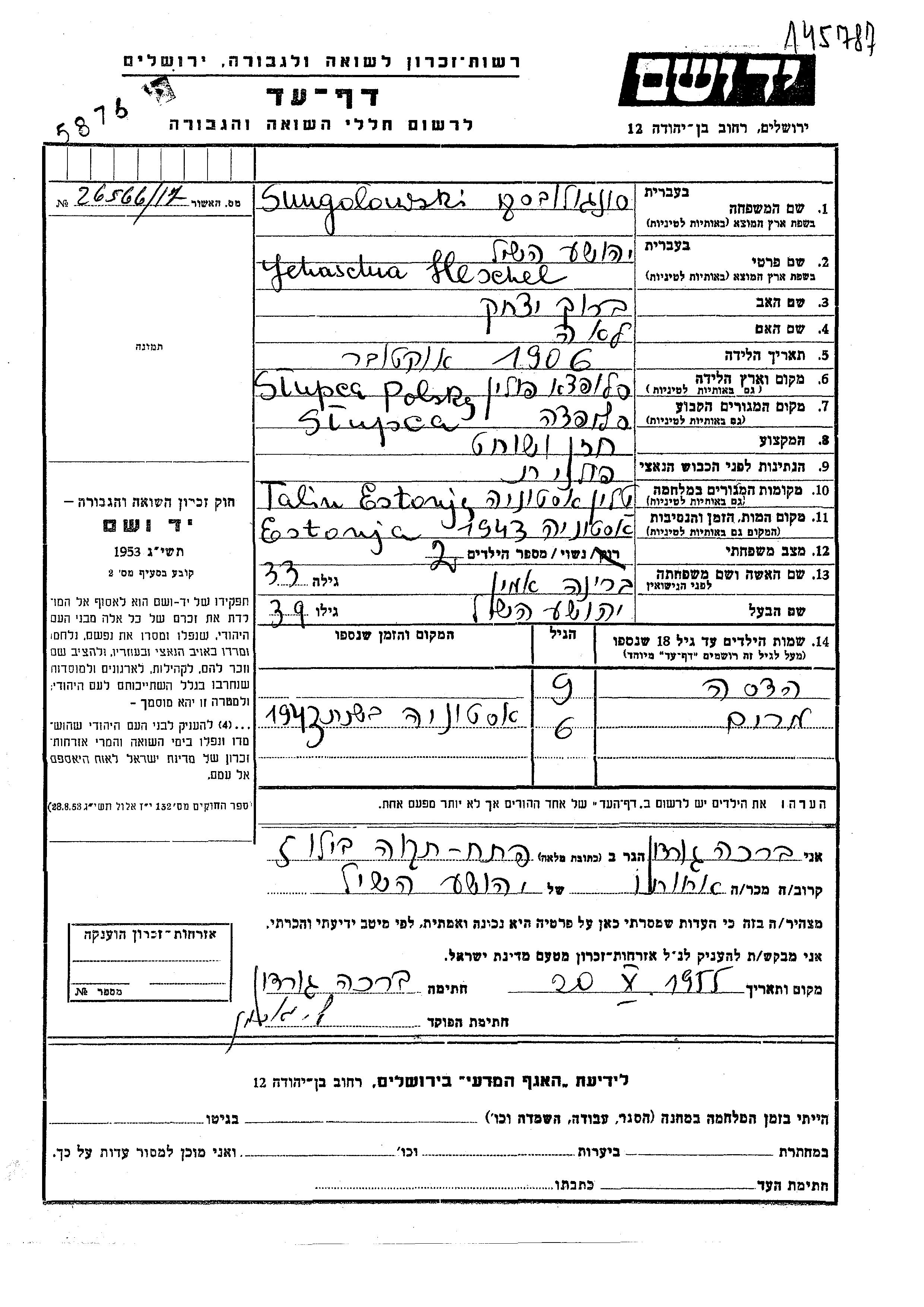 Sungolovski Heshil 1906 Slupca, Polen Gedenkblatt
