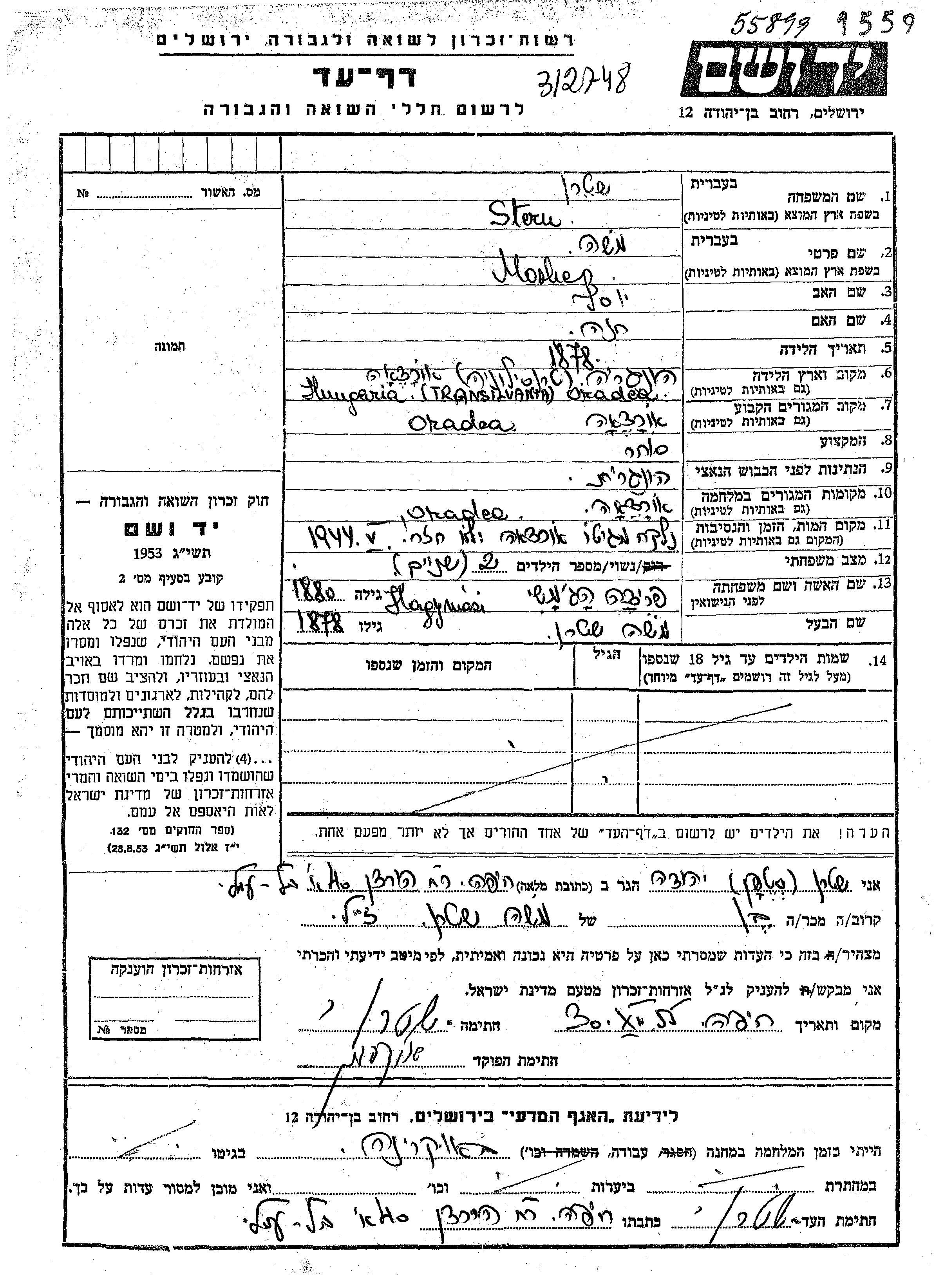 Moshe Stern wurde im Jahr 1878 in Oradea, Rumänien geboren. Er war der Sohn von Yosef und Khana. Er war Kaufmann/-frau und mit Frida, geb. Hagimashi Verheiratet. Vor dem Zweiten Weltkrieg lebte er in Oradea, Rumänien. Während des Krieges war er in Oradea, Rumänien.