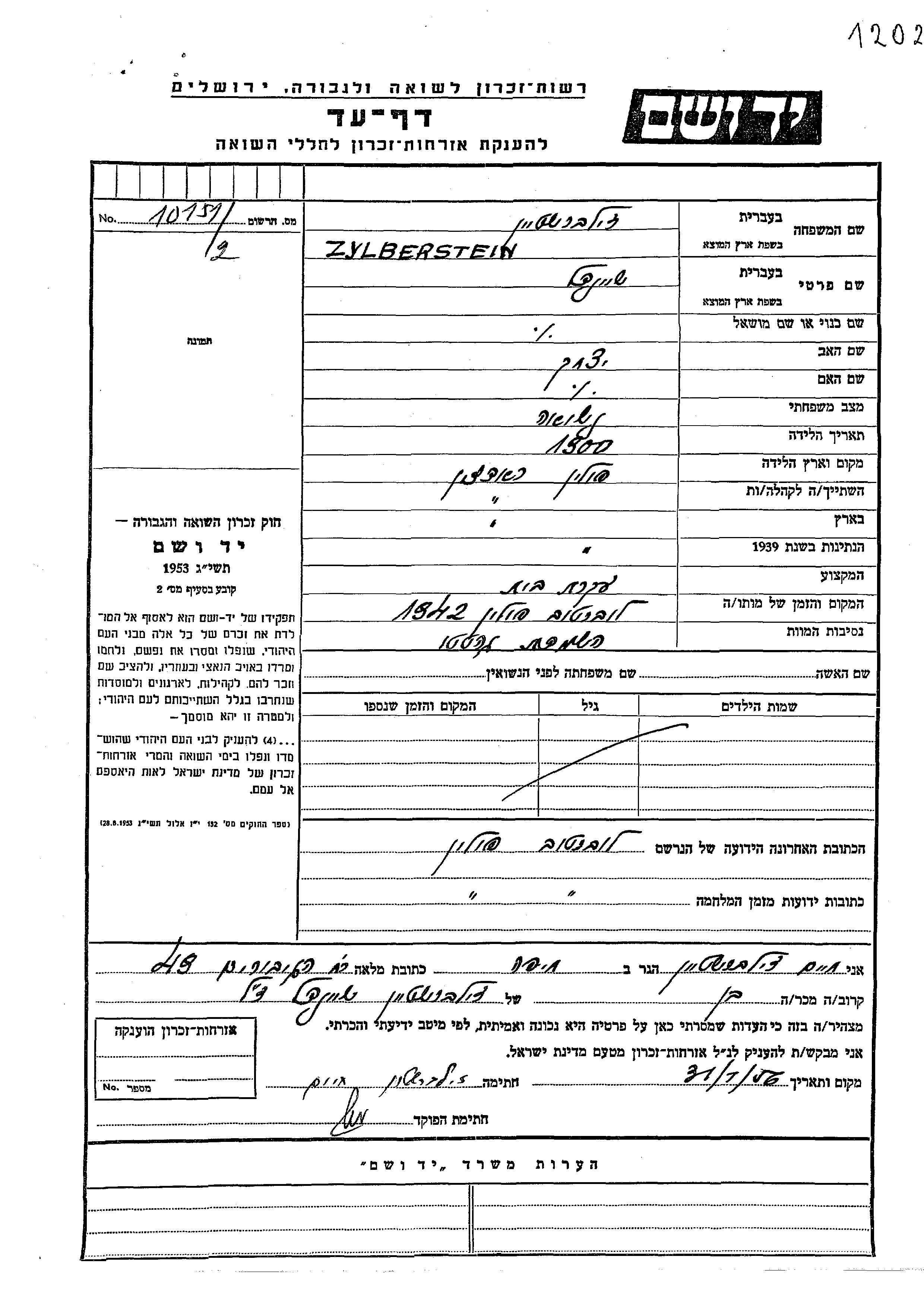 Zylberstein Sheindl 1900 Radzin, Polen Gedenkblatt