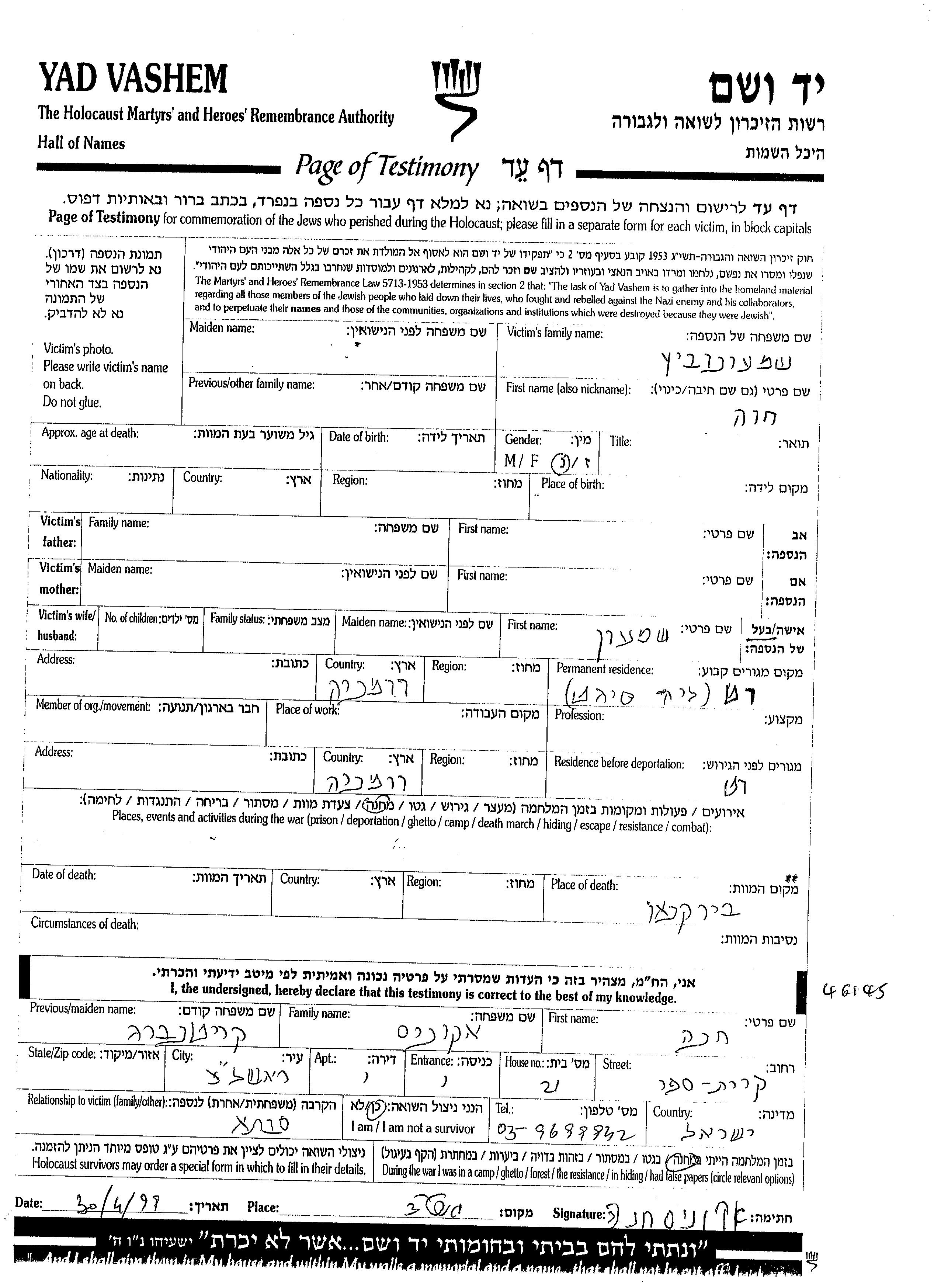 Khava Shemonovitz. Sie war mit Shimon Verheiratet. Vor dem Zweiten Weltkrieg lebte sie in Ieud, Rumänien. Während des Krieges war sie in Ieud, Rumänien.