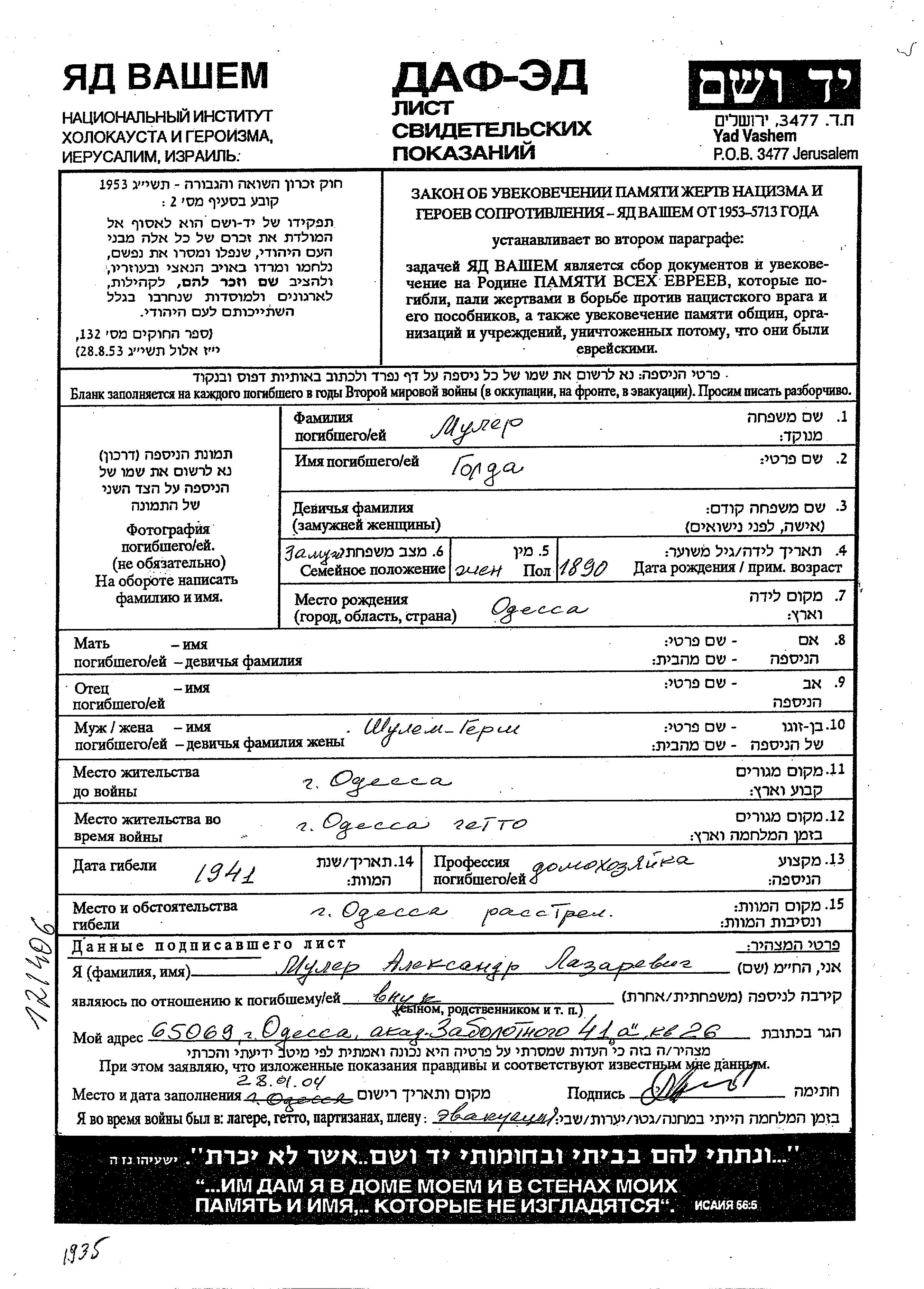 Golda Muler wurde im Jahr 1890 in Odessa, Ukraine (UdSSR) geboren. Sie war Hausfrau und mit Shulem Gersh Verheiratet. Vor dem Zweiten Weltkrieg lebte sie in Odessa, Ukraine (UdSSR). Während des Krieges war sie in Odessa, Ukraine (UdSSR).