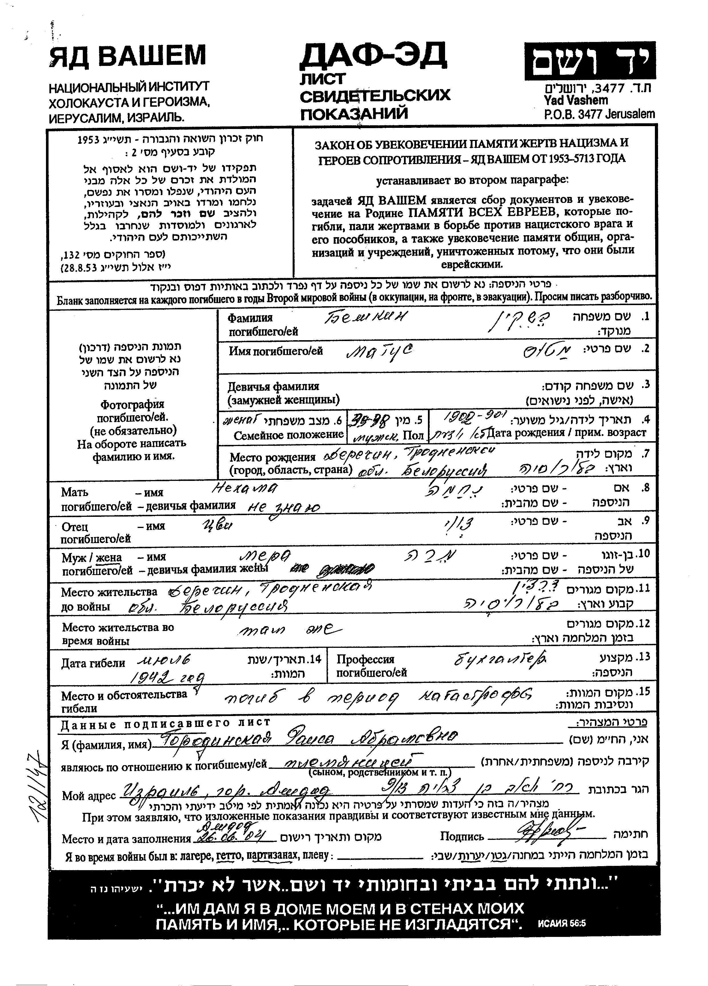 Matus Beshkin wurde im Jahr 1901 in Derechin, Polen geboren. Er war der Sohn von Tzvi und Nekhama. Er war Buchhalter/-in und mit Mera Verheiratet. Vor dem Zweiten Weltkrieg lebte er in Derechin, Polen. Während des Krieges war er in Derechin, Polen.
