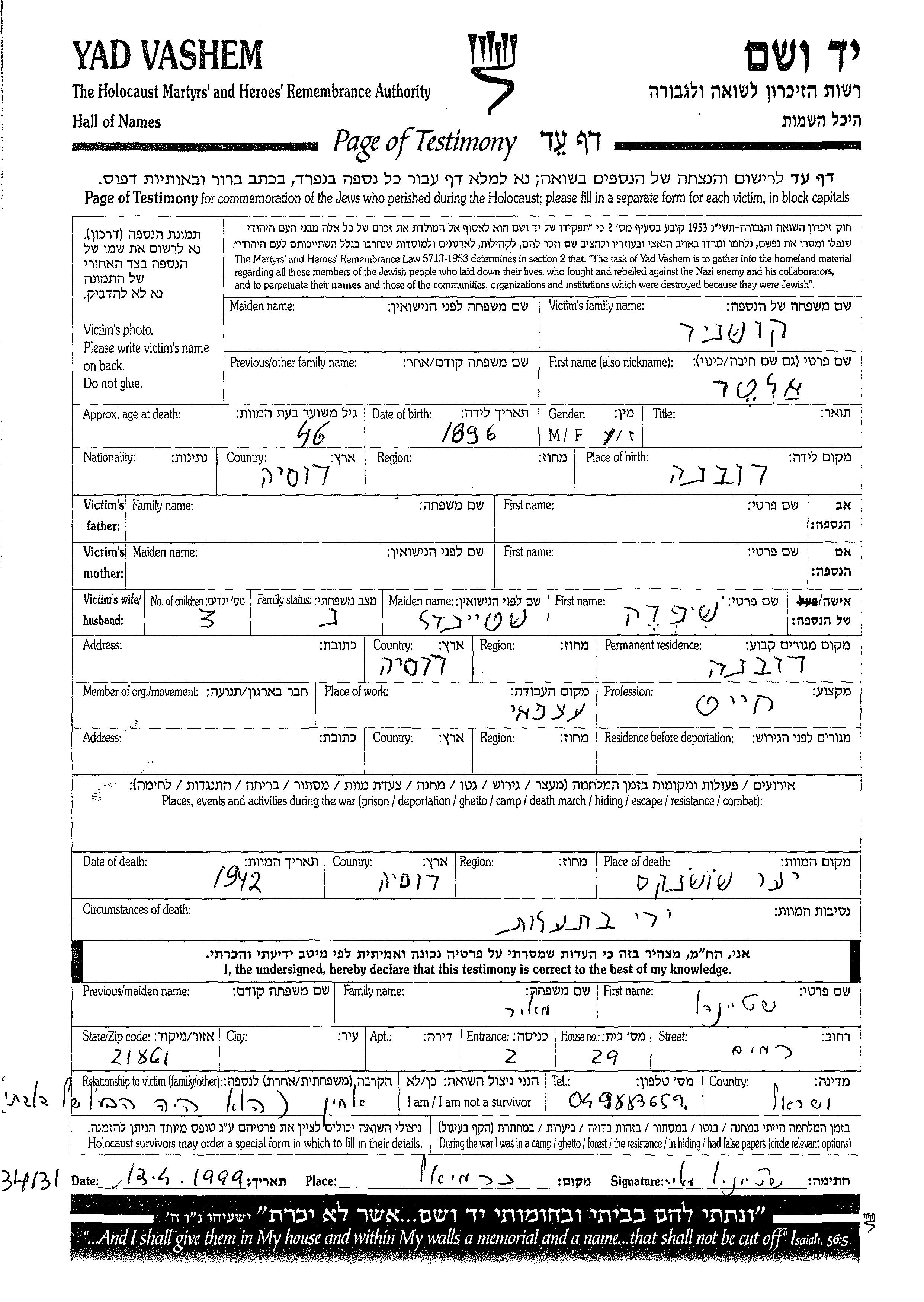 Alter Kushnir wurde im Jahr 1896 in Rowne, Polen geboren. Er war Schneider und mit Shifra, geb. Shteindel Verheiratet. Vor dem Zweiten Weltkrieg lebte er in Rowne, Polen. Während des Krieges war er in Rowne, Polen.