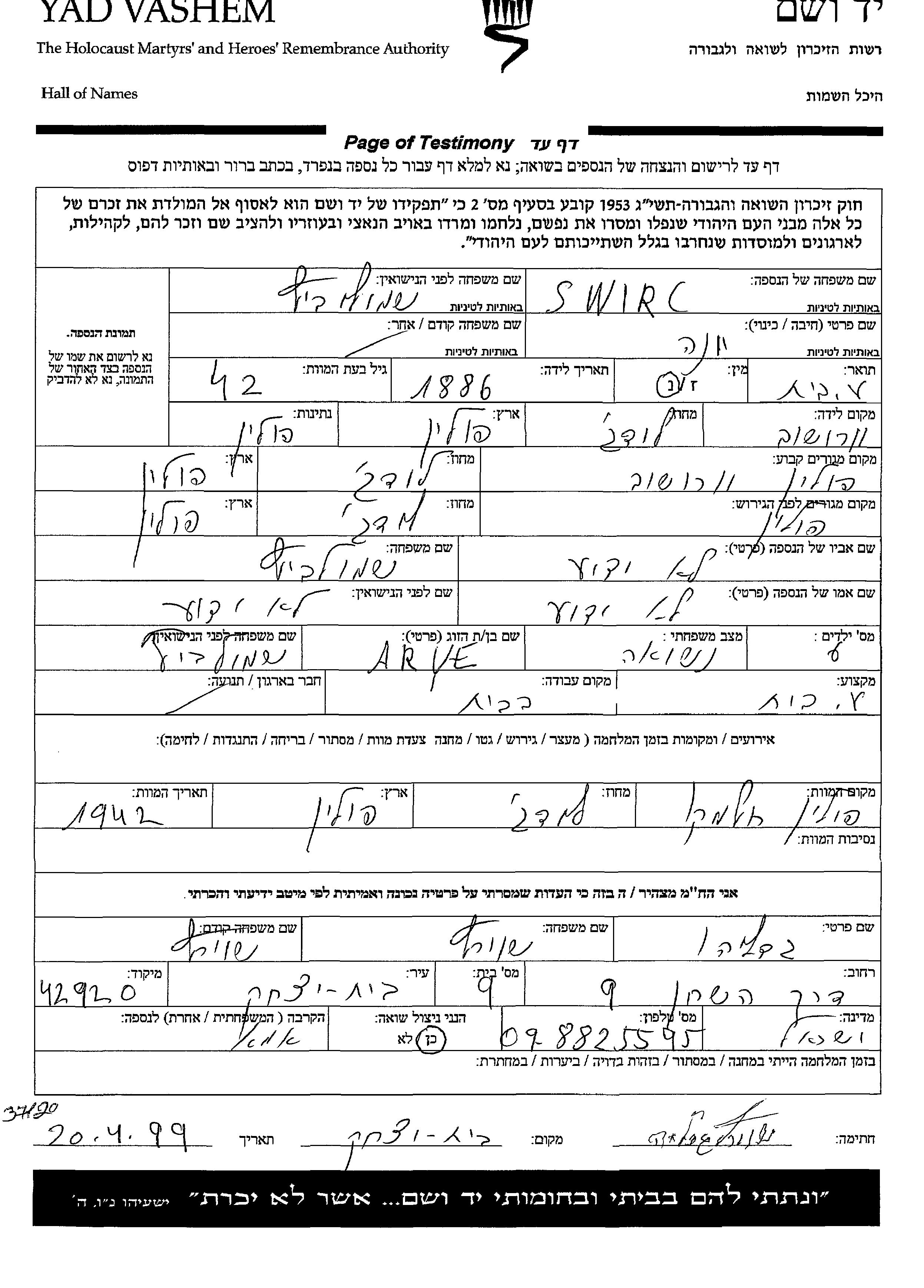 Ana Swirc, geb. Shmulevitz wurde im Jahr 1886 in Wieruszow, Polen geboren. Sie war Hausfrau und mit Arye Verheiratet. Vor dem Zweiten Weltkrieg lebte sie in Polen. Während des Krieges war sie in Polen.