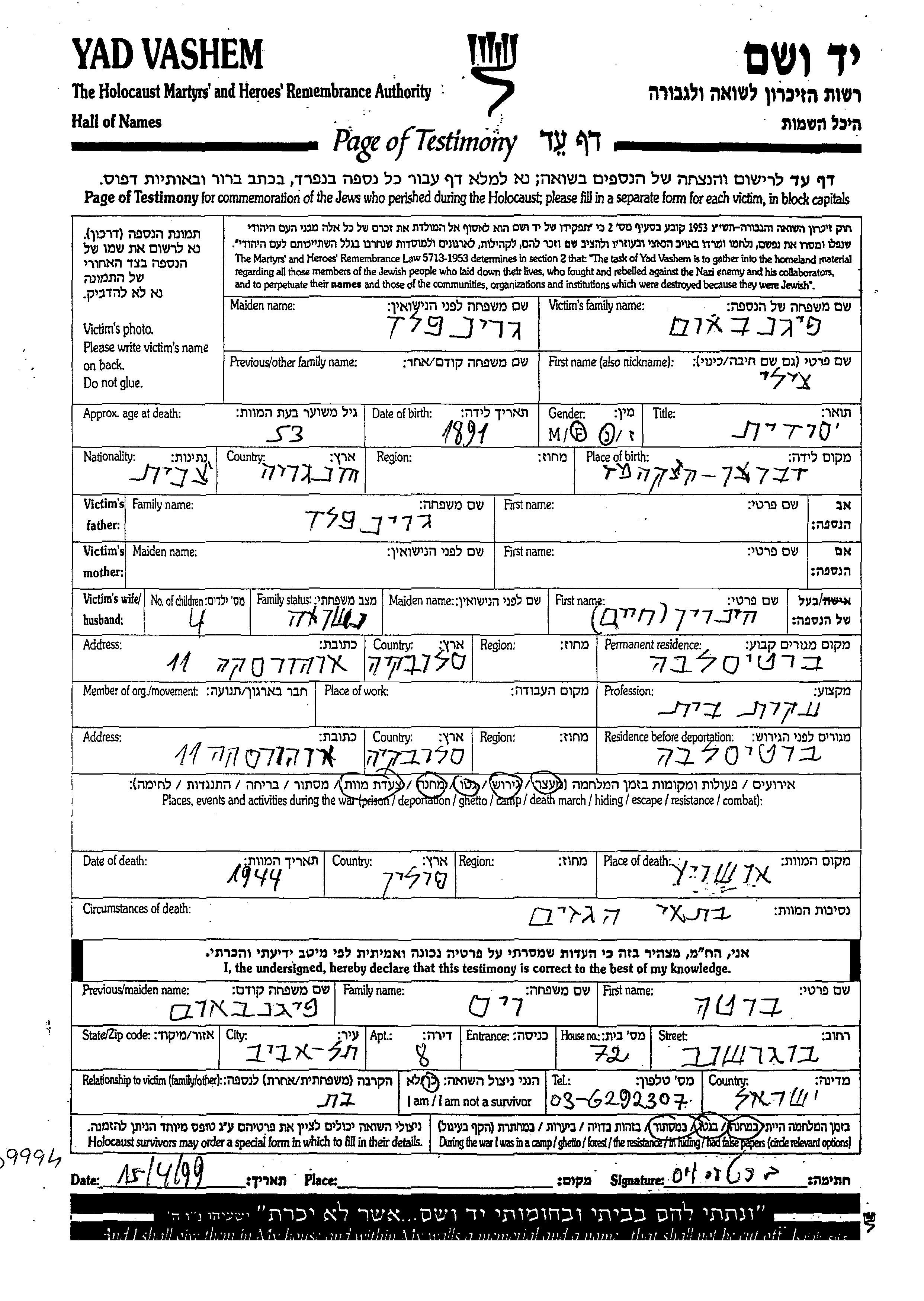 Tzili Feigenbaum, geb. Grinfeld wurde im Jahr 1891 in Debrecen, Ungarn geboren. Sie war Hausfrau und mit Henrik Khaim Verheiratet. Vor dem Zweiten Weltkrieg lebte sie in Bratislava, Tschechoslowakei. Während des Krieges war sie in Bratislava, Tschechoslowakei.