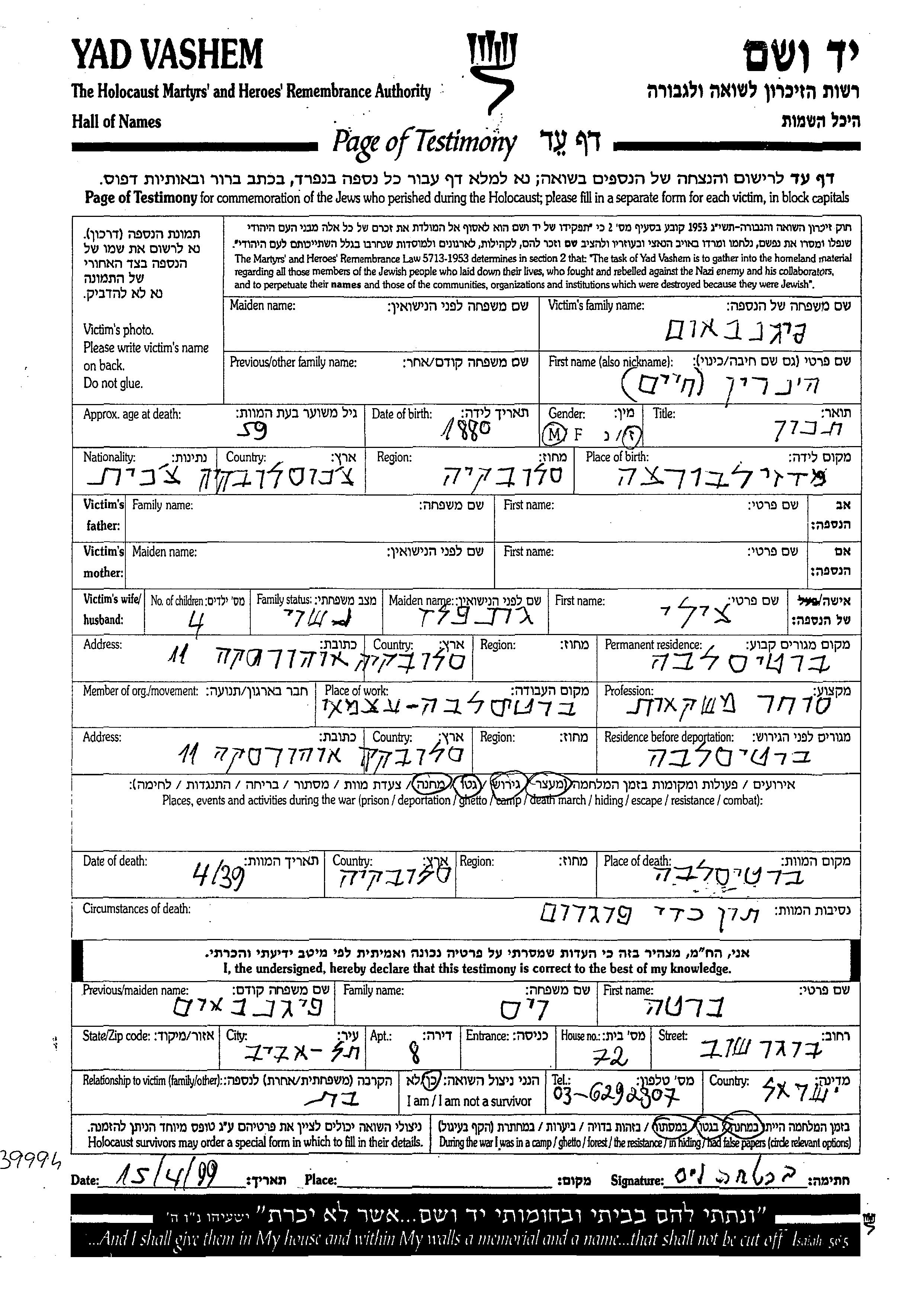 Henrik Khaim Feigenbaum wurde im Jahr 1880 in Medzilaborce, Tschechoslowakei geboren. Er war Getränkehändler und mit Tzili, geb. Herenfeld Verheiratet. Vor dem Zweiten Weltkrieg lebte er in Bratislava, Tschechoslowakei. Während des Krieges war er in Bratislava, Tschechoslowakei.