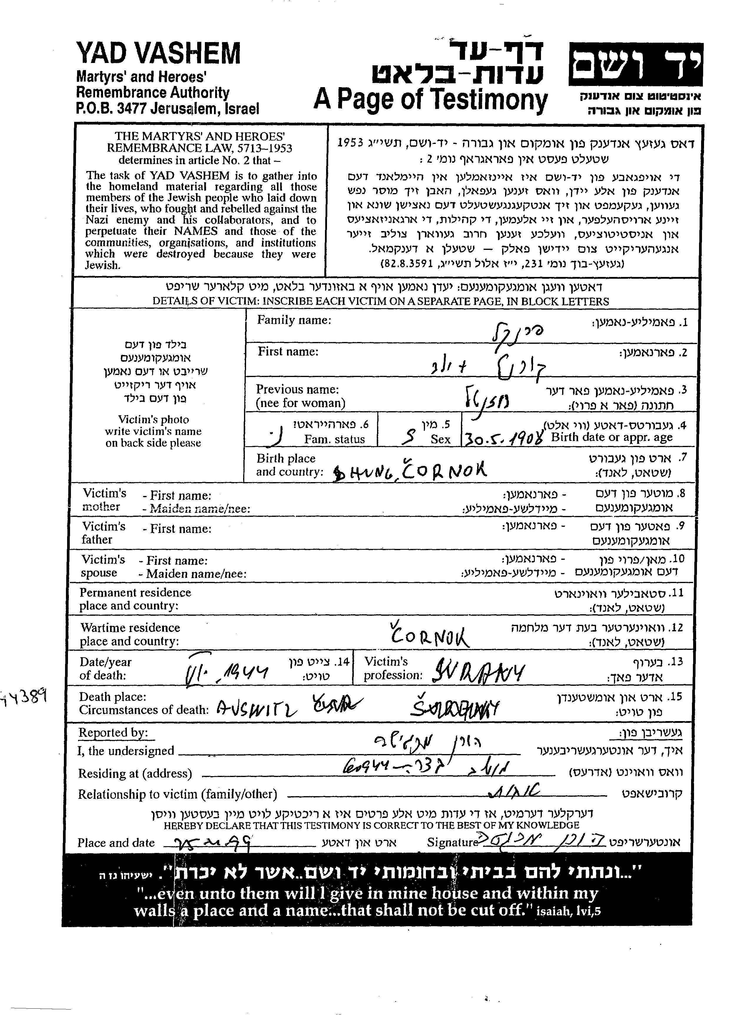 Kornel wurde in der Schoah ermordet. Todesort: Auschwitz, Polen im Jahr 06/1944.