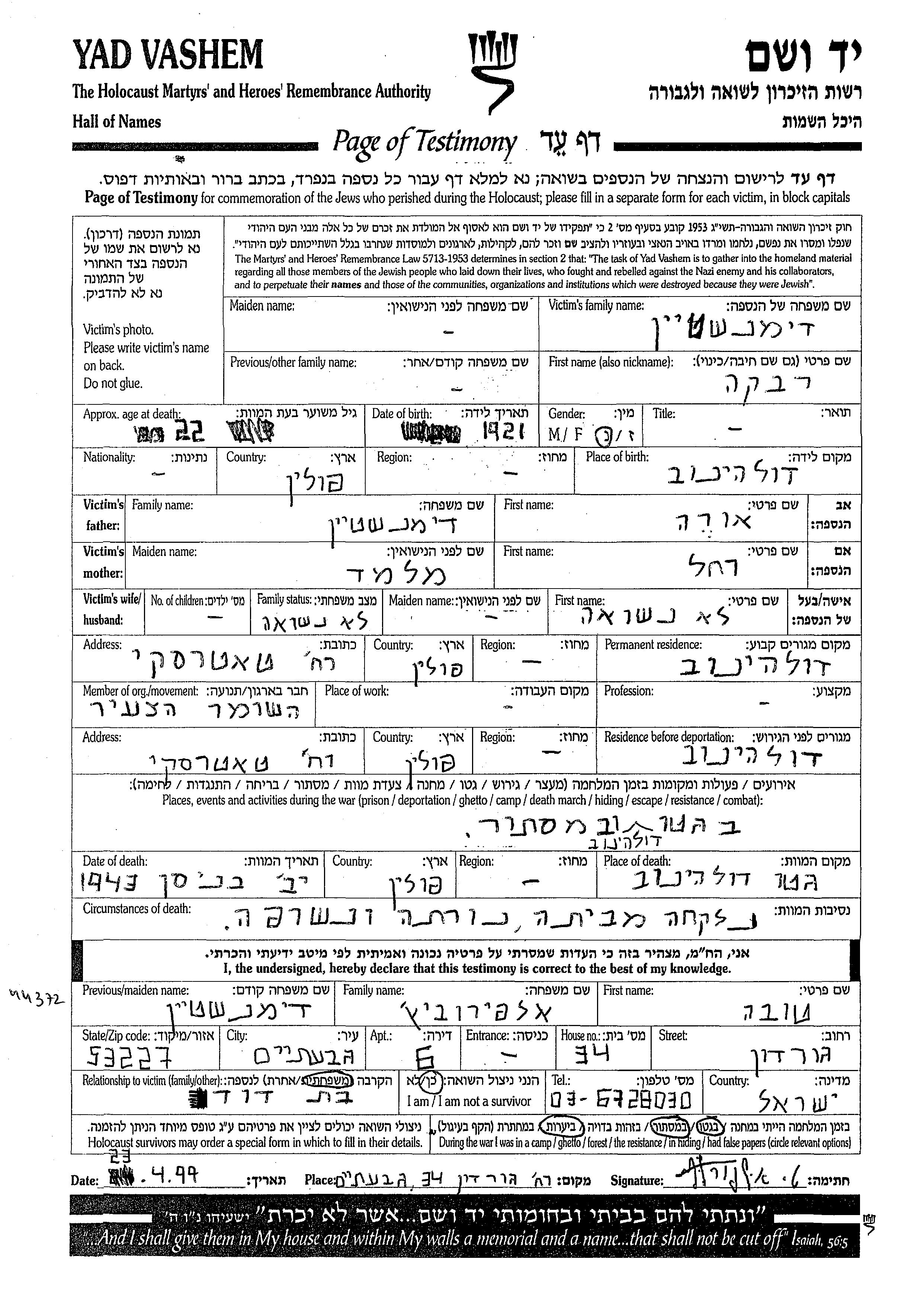 Rivka Dimenshtein wurde im Jahr 1921 in Dolhinow, Polen geboren. Sie war die Tochter von Arie und Rakhel, geb. Melamed. Sie war Ledig. Vor dem Zweiten Weltkrieg lebte sie in Dolhinow, Polen. Während des Krieges war sie in Dolhinow, Polen.