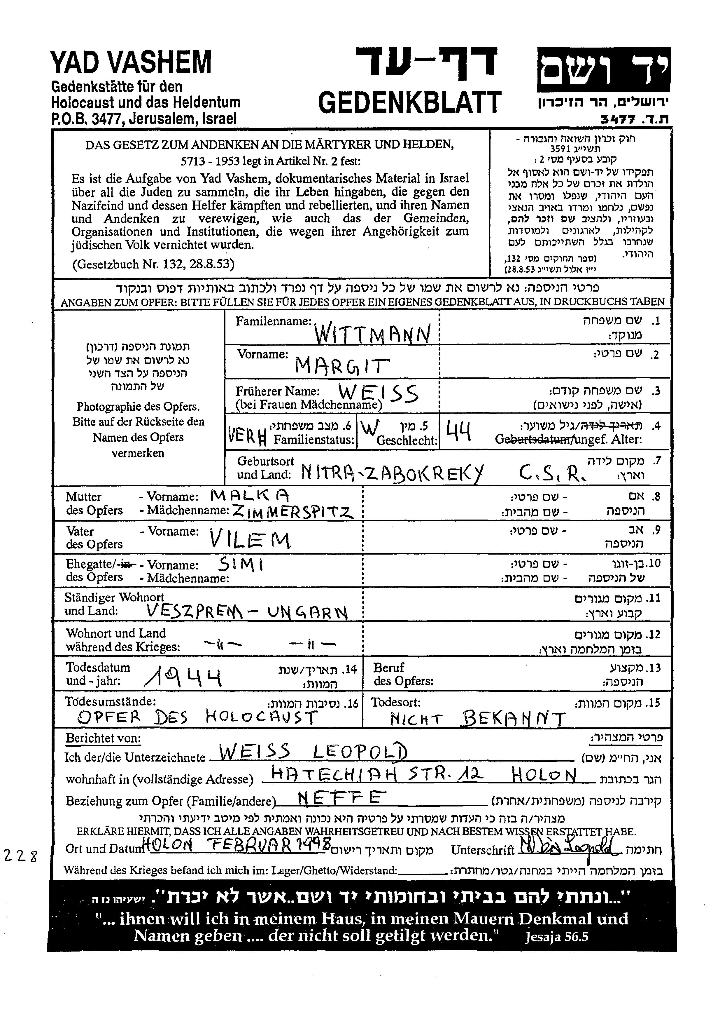 Margit Wittmann, geb. Weiss wurde in Zabokreky, Tschechoslowakei geboren. Sie war die Tochter von Vilem und Malka, geb. Zimmerspitz. Sie war mit Simi Verheiratet. Vor dem Zweiten Weltkrieg lebte sie in Veszprem, Ungarn. Während des Krieges war sie in Veszprem, Ungarn.