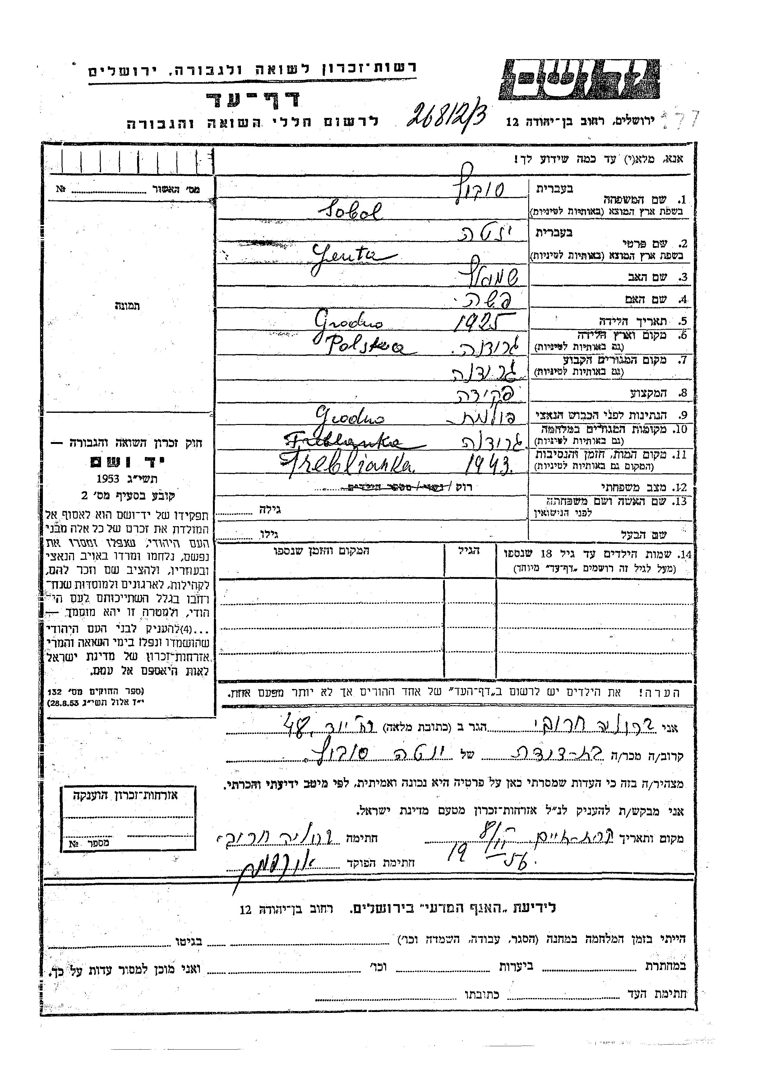 Yenta Sobol wurde im Jahr 1925 in Grodno, Polen geboren. Sie war die Tochter von Shmuel und Pasha. Sie war Angestellte/-r und Ledig. Vor dem Zweiten Weltkrieg lebte sie in Grodno, Polen. Während des Krieges war sie in Grodno, Polen.