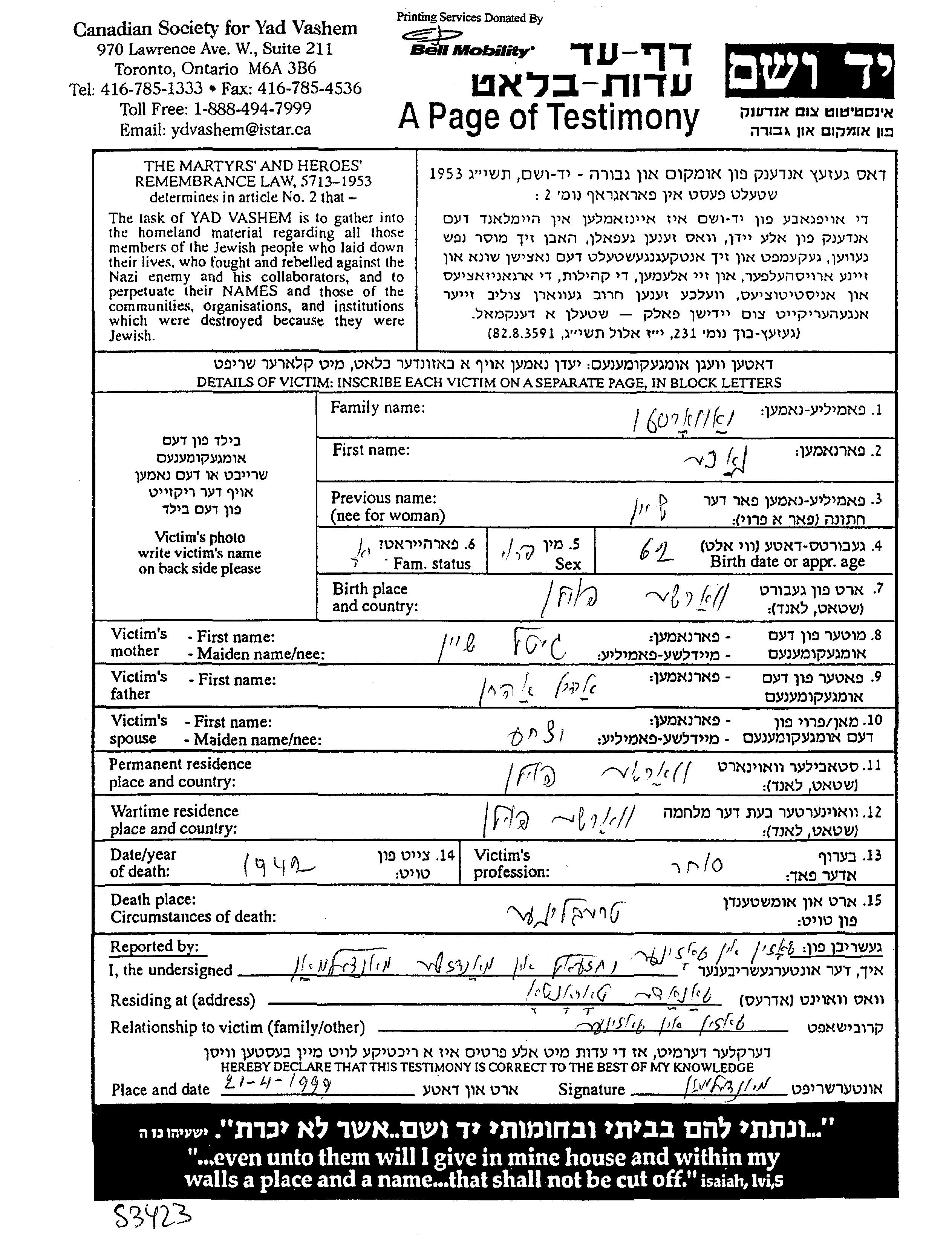 Nakhe Iavorski, geb. Shein wurde in Warszawa, Polen geboren. Sie war die Tochter von Aharon und Gitel, geb. Shein. Sie war Kaufmann/-frau und mit Yitzkhak Verheiratet. Vor dem Zweiten Weltkrieg lebte sie in Warszawa, Polen. Während des Krieges war sie in Warszawa, Polen.