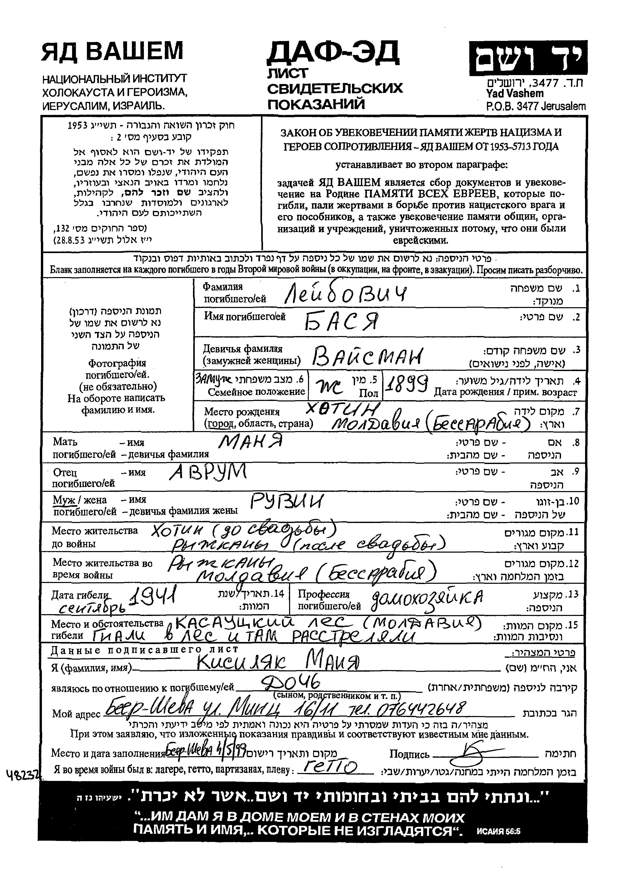 Basya Leibovich, geb. Vaisman wurde im Jahr 1899 in Khotin, Rumänien geboren. Sie war die Tochter von Avrum und Manya. Sie war Hausfrau und mit Ruvin Verheiratet. Vor dem Zweiten Weltkrieg lebte sie in Khotin, Rumänien. Während des Krieges war sie in Ryshkany, Rumänien.