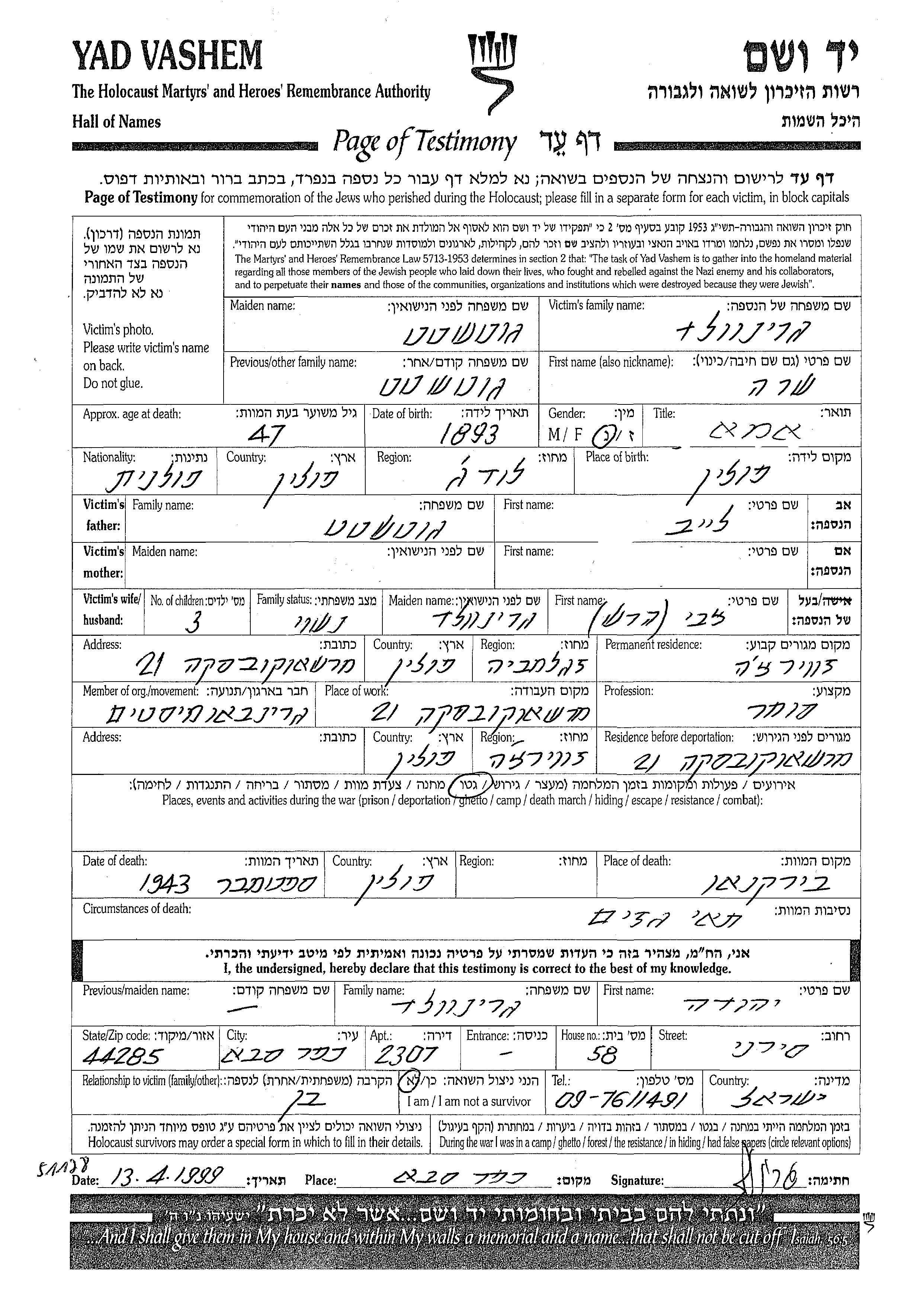 Sara Grinvald, geb. Gutshtat wurde im Jahr 1893 in Lodz, Polen geboren. Sie war die Tochter von Leib. Sie war Kaufmann/-frau und mit Tzvi Hersh Verheiratet. Vor dem Zweiten Weltkrieg lebte sie in Szczebrzeszyn, Polen. Während des Krieges war sie in Getto.