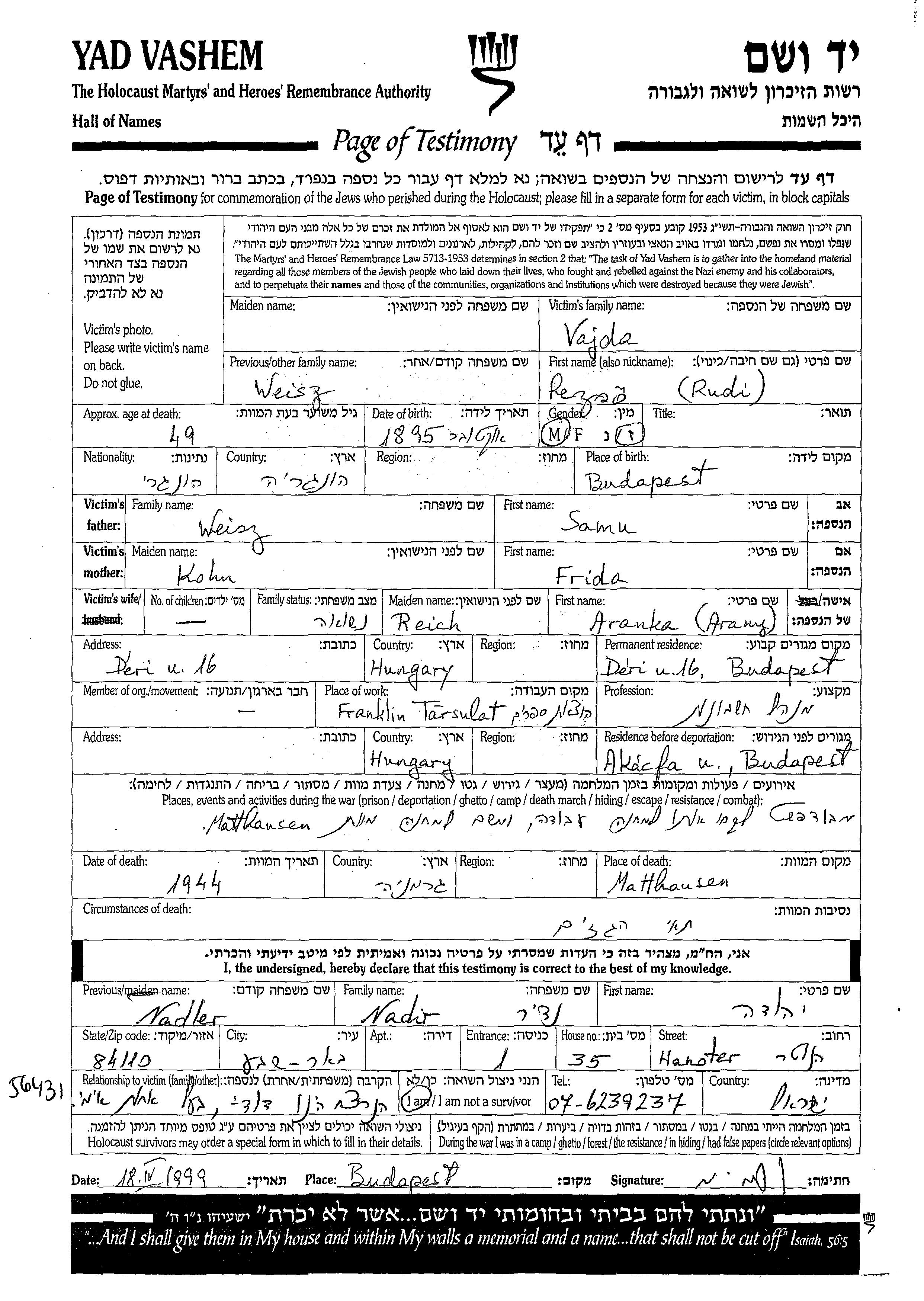 Rezso Rudi Weisz Vajda wurde im Jahr 1895 in Budapest, Ungarn geboren. Er war der Sohn von Samu und Frida, geb. Kohn. Er war Buchhalter/-in und mit Aranka, geb. Reich Verheiratet. Vor dem Zweiten Weltkrieg lebte er in Budapest, Ungarn. Während des Krieges war er in Budapest, Ungarn.