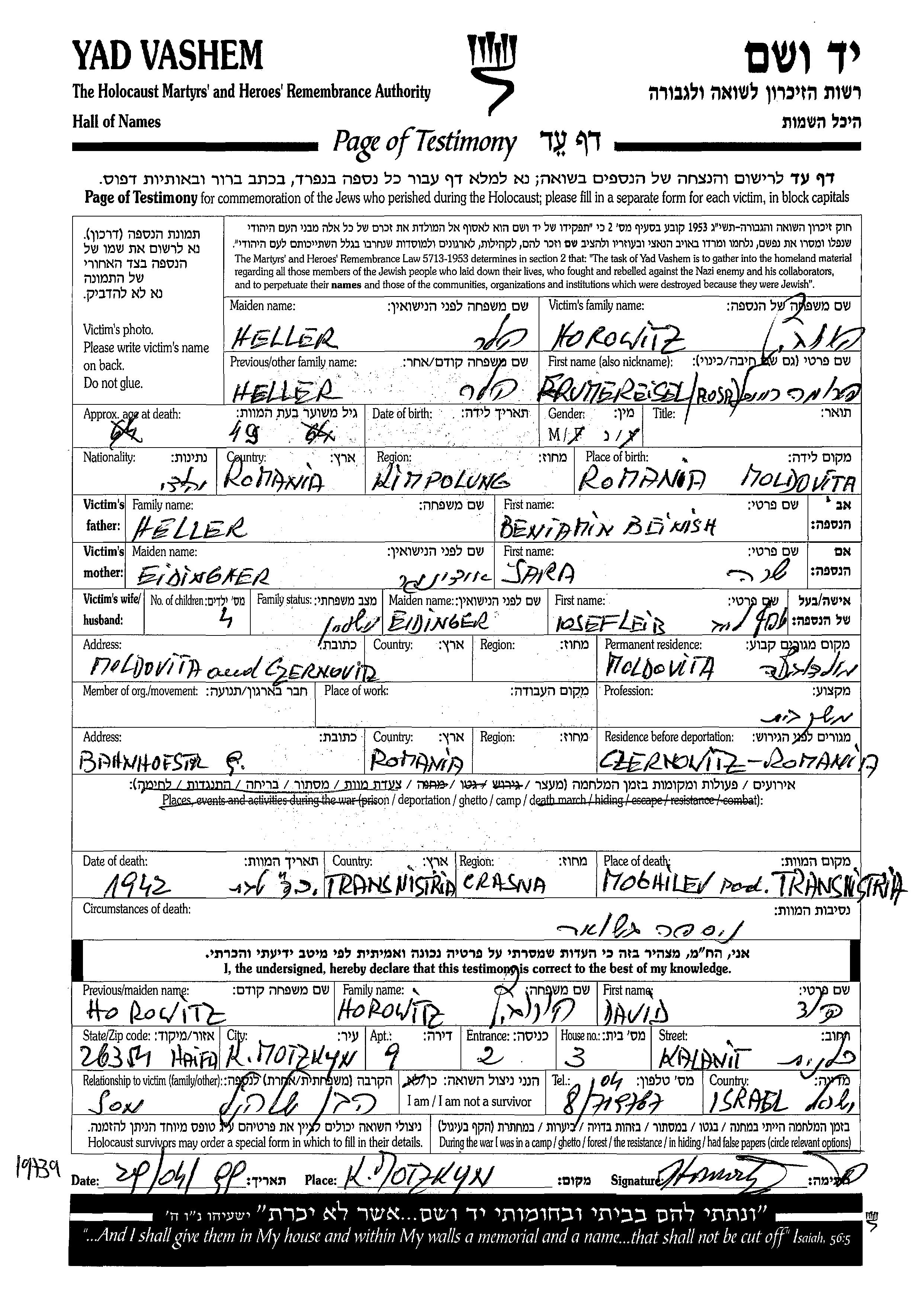 Fruma Roza Horovitz, geb. Heler wurde in Moldovita, Rumänien geboren. Sie war die Tochter von Beinish Beniamin und Sara, geb. Eidinger. Sie war Hausfrau und mit Leib Yosef Verheiratet. Vor dem Zweiten Weltkrieg lebte sie in Moldovita, Rumänien. Während des Krieges war sie in Cernautzi, Rumänien.