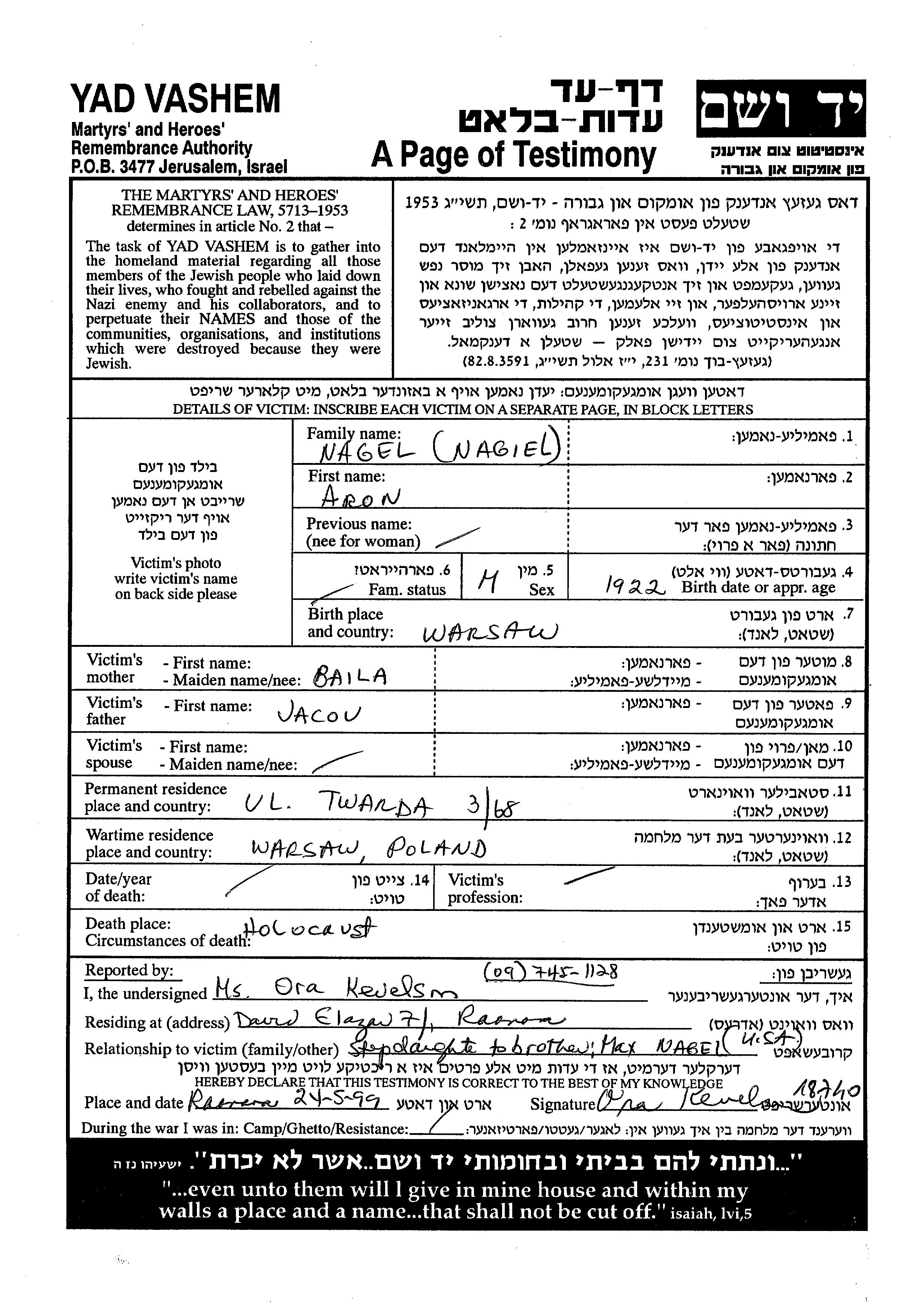 Aron Nagel wurde im Jahr 1922 in Warsaw, Polen geboren. Er war der Sohn von Jacov und Baila. Er war Ledig. Vor dem Zweiten Weltkrieg lebte er in Warsaw, Polen. Während des Krieges war er in Warsaw, Polen.