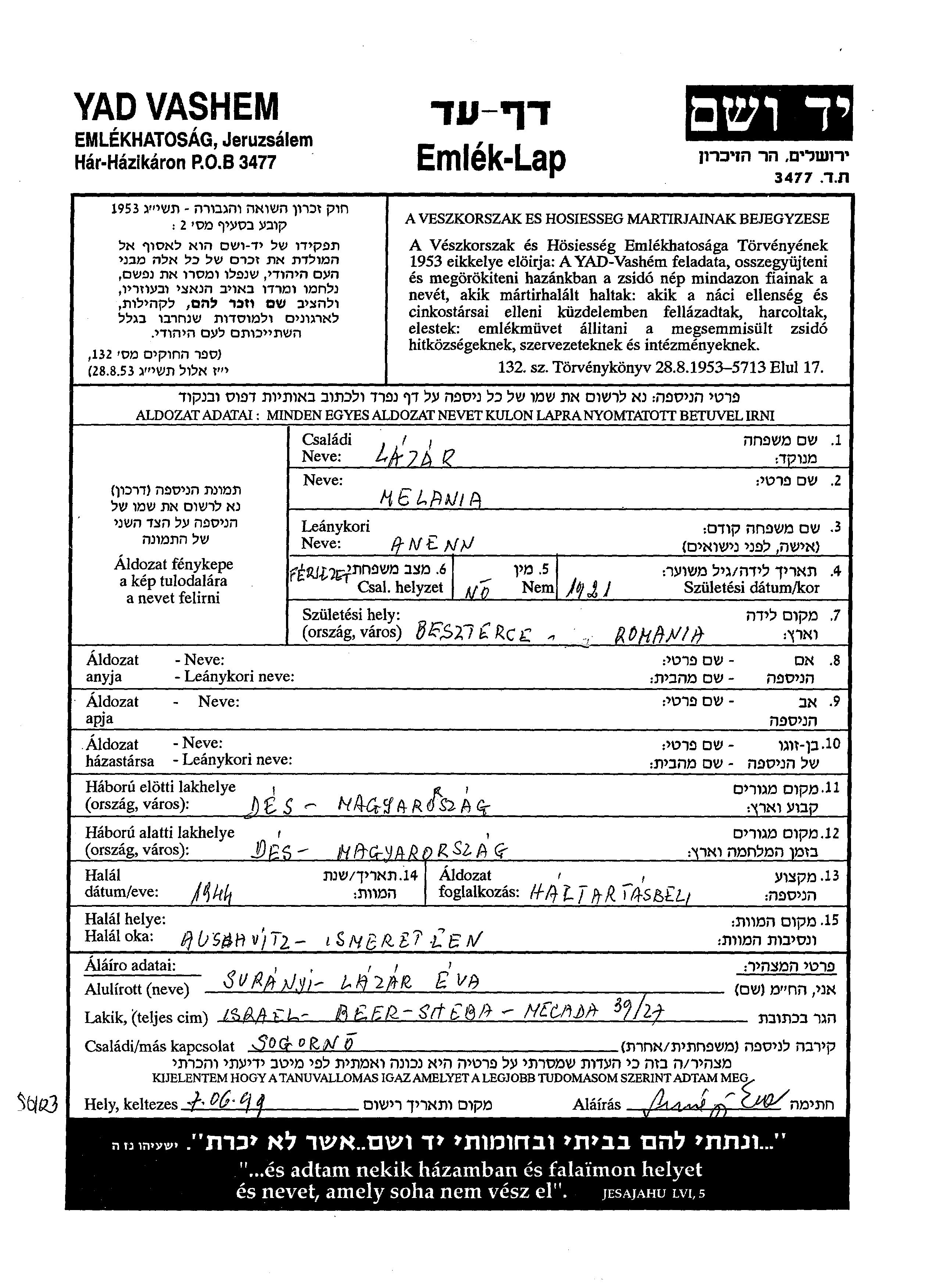 Melania Lazar, geb. Amenn wurde im Jahr 1921 in Beszterce, Rumänien geboren. Sie war Hausfrau und Verheiratet. Vor dem Zweiten Weltkrieg lebte sie in Des, Rumänien. Während des Krieges war sie in Des, Rumänien.