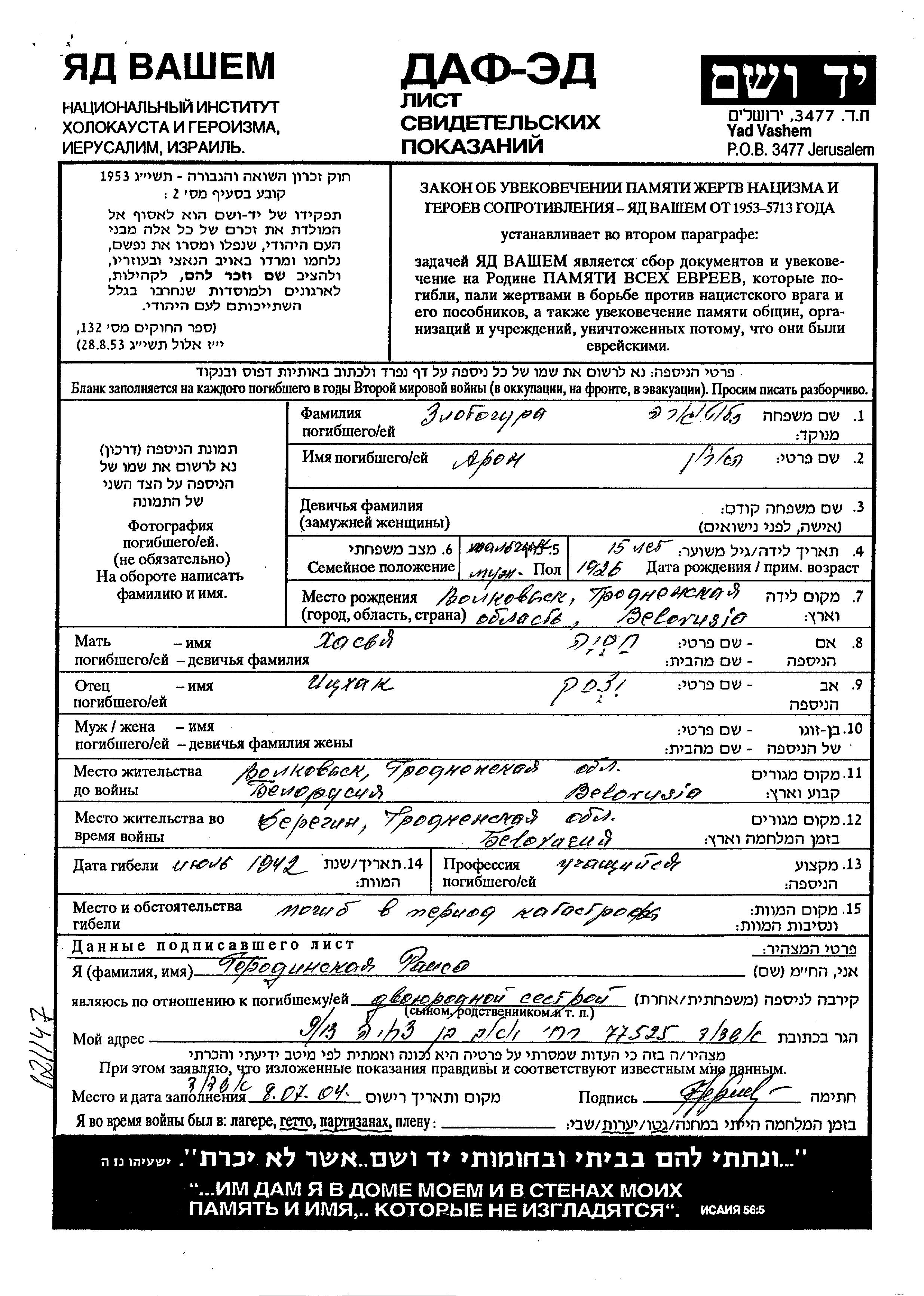 Aron Zlotogora wurde im Jahr 1926 in Volkovysk, Polen geboren. Er war der Sohn von Yitzkhak und Khasia. Er war Uchashchiysya und Kind. Vor dem Zweiten Weltkrieg lebte er in Volkovysk, Polen. Während des Krieges war er in Derechin, Polen.