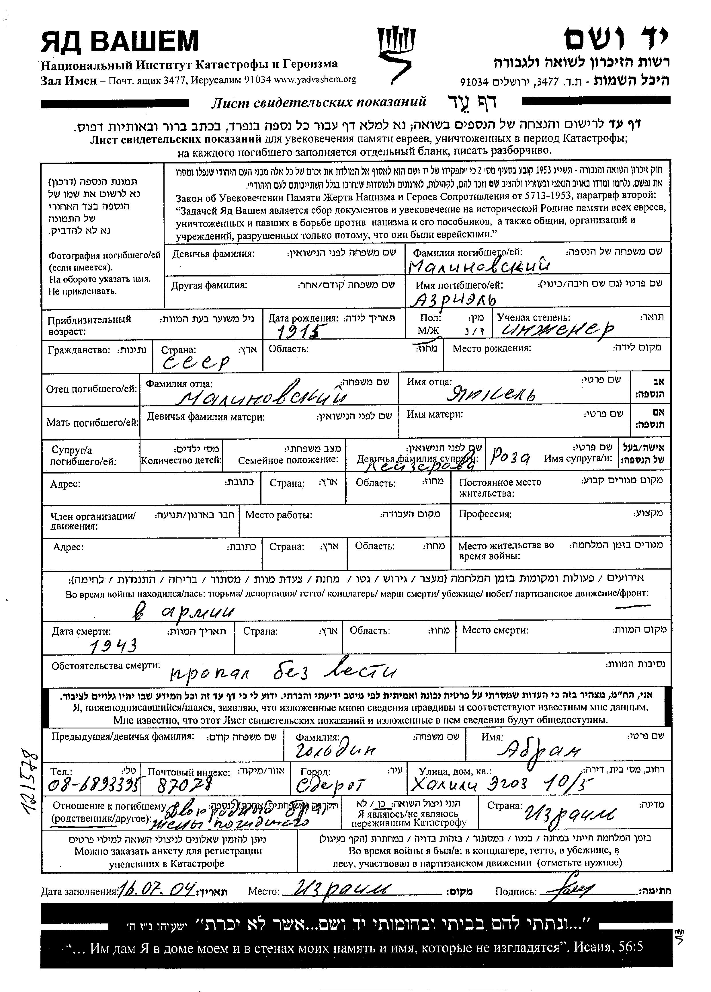 Azriel Malinovski wurde im Jahr 1915 geboren. Er war der Sohn von Yankel. Er war Ingenieur und mit Roza, geb. Leizerova Verheiratet. Vor dem Zweiten Weltkrieg lebte er in Sowjetunion. Während des Krieges war er in die Sowjetischen Streitkräfte.