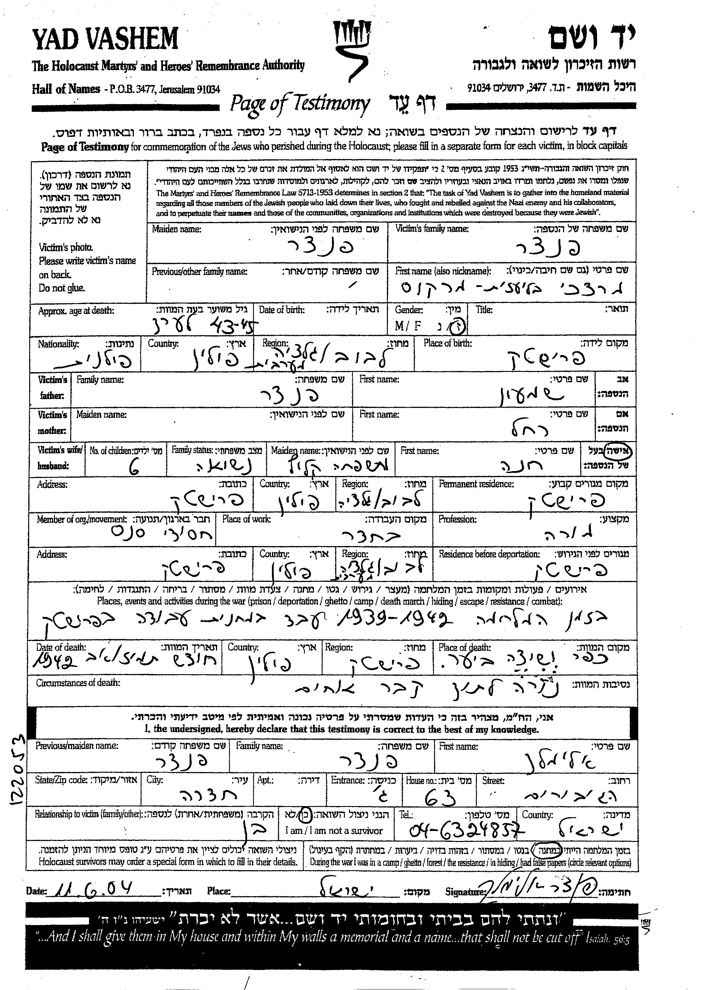 Mordekhai Markus Pantzer wurde in Frisztak, Polen geboren. Er war der Sohn von Shimon und Rakhel. Er war Religious elementary school teacher und mit Khana, geb. Klif Verheiratet. Vor dem Zweiten Weltkrieg lebte er in Frisztak, Polen. Während des Krieges war er in Frisztak, Polen.