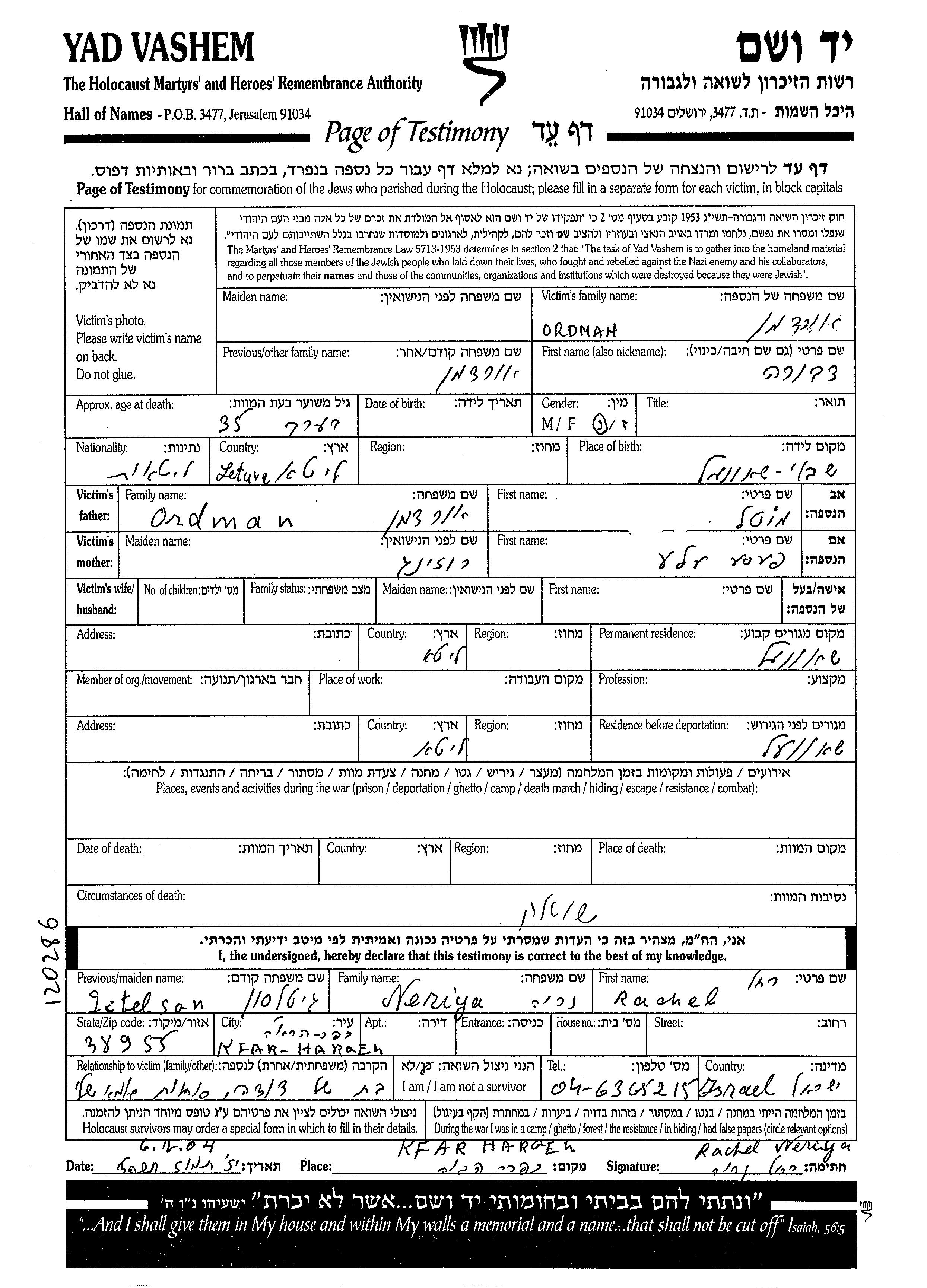 Dvora Ordman wurde in Shavli, Litauen geboren. Sie war die Tochter von Motel und Ele Yosefa, geb. Rozing. Vor dem Zweiten Weltkrieg lebte sie in Shavli, Litauen. Während des Krieges war sie in Shavli, Litauen.