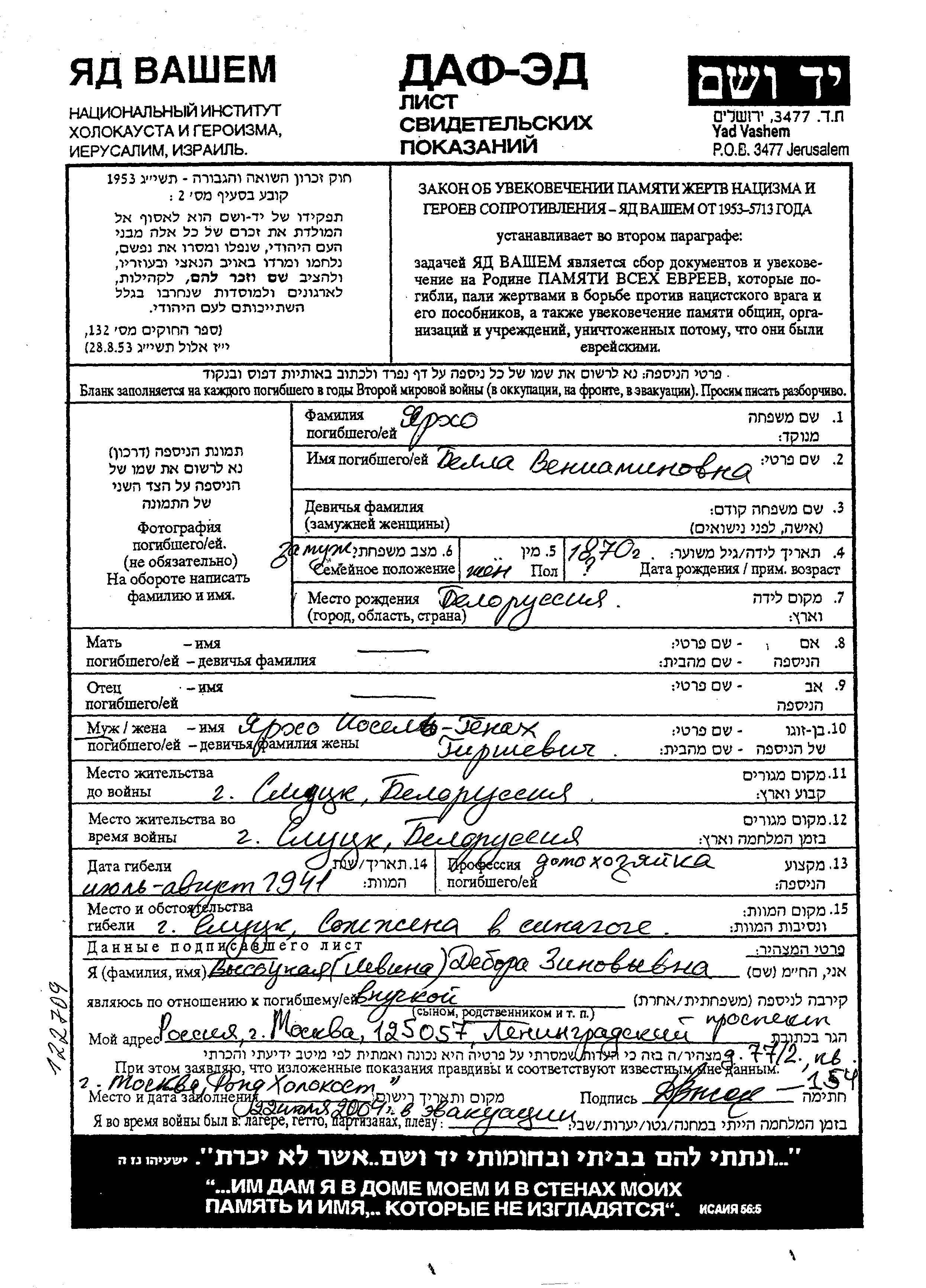 Bella Yarkho wurde im Jahr 1870 in Weißrussland (UdSSR) geboren. Sie war die Tochter von Veniamin. Sie war Hausfrau und mit Genakh Ioselei Verheiratet. Vor dem Zweiten Weltkrieg lebte sie in Slutsk, Weißrussland (UdSSR). Während des Krieges war sie in Slutsk, Weißrussland (UdSSR).
