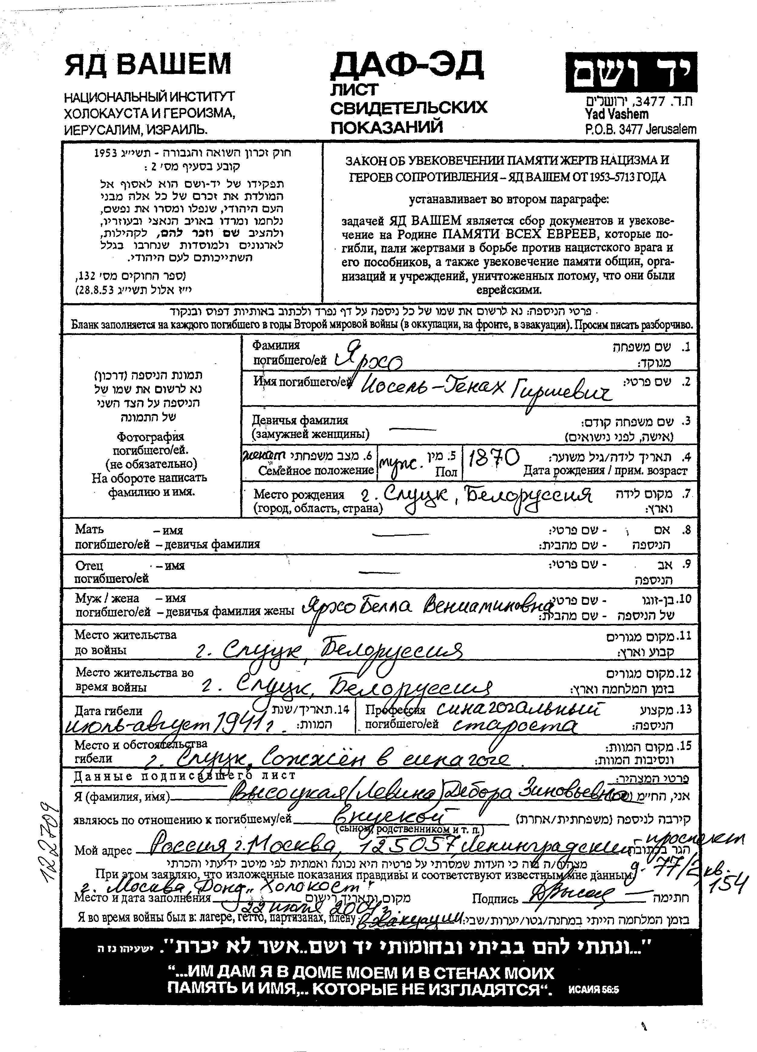 Genakh Ioselei Yarkho wurde im Jahr 1870 in Slutsk, Weißrussland (UdSSR) geboren. Er war der Sohn von Girsh. Er war Starosta v sinagoge und mit Bella Verheiratet. Vor dem Zweiten Weltkrieg lebte er in Slutsk, Weißrussland (UdSSR). Während des Krieges war er in Slutsk, Weißrussland (UdSSR).