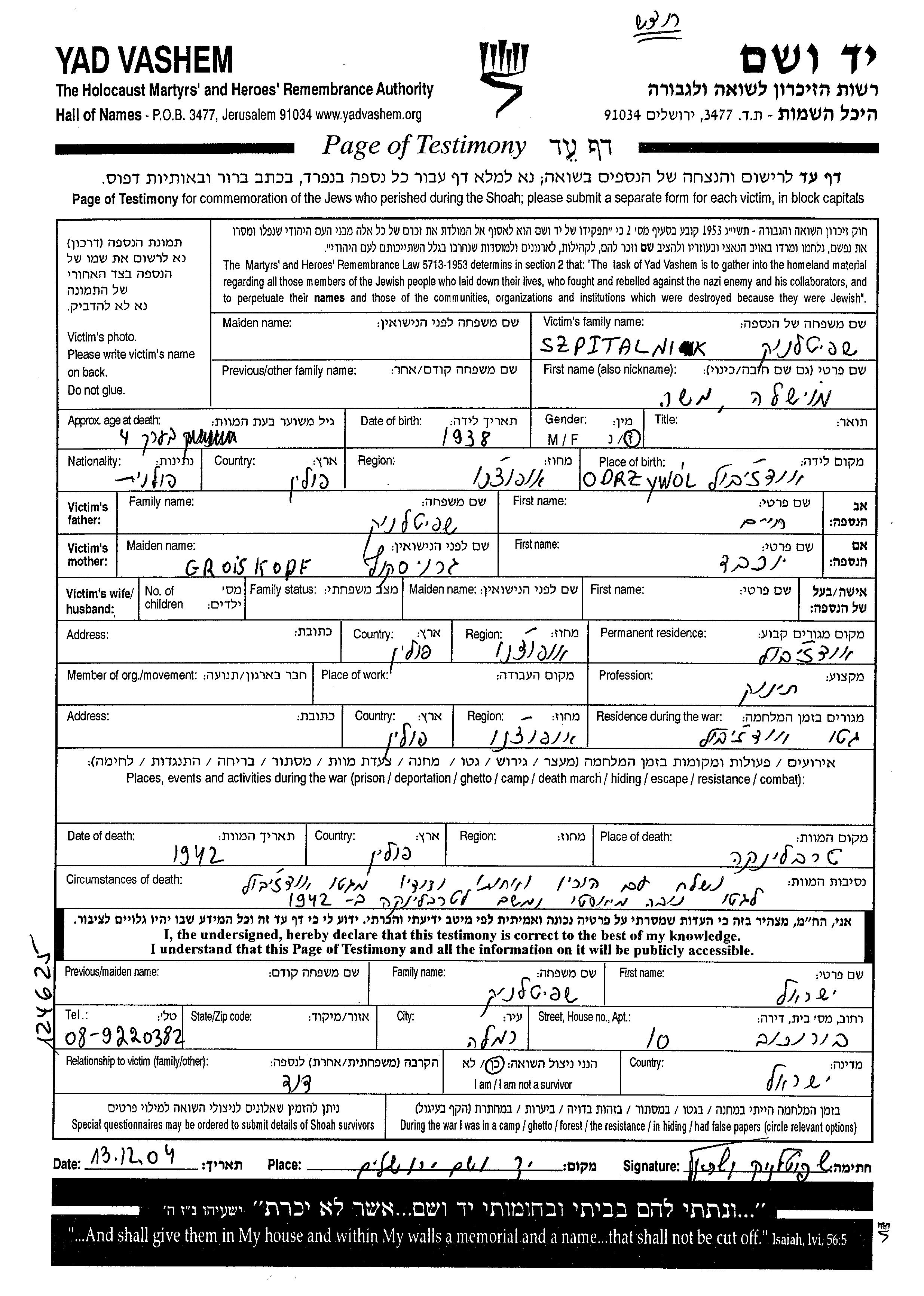 Moishele Shpitalnik wurde im Jahr 1938 in Odrzywol, Polen geboren. Er war der Sohn von Khaim und Yokheved, geb. Groiskop. Er war Kind. Vor dem Zweiten Weltkrieg lebte er in Odrzywol, Polen. Während des Krieges war er in Odrzywol, Polen.