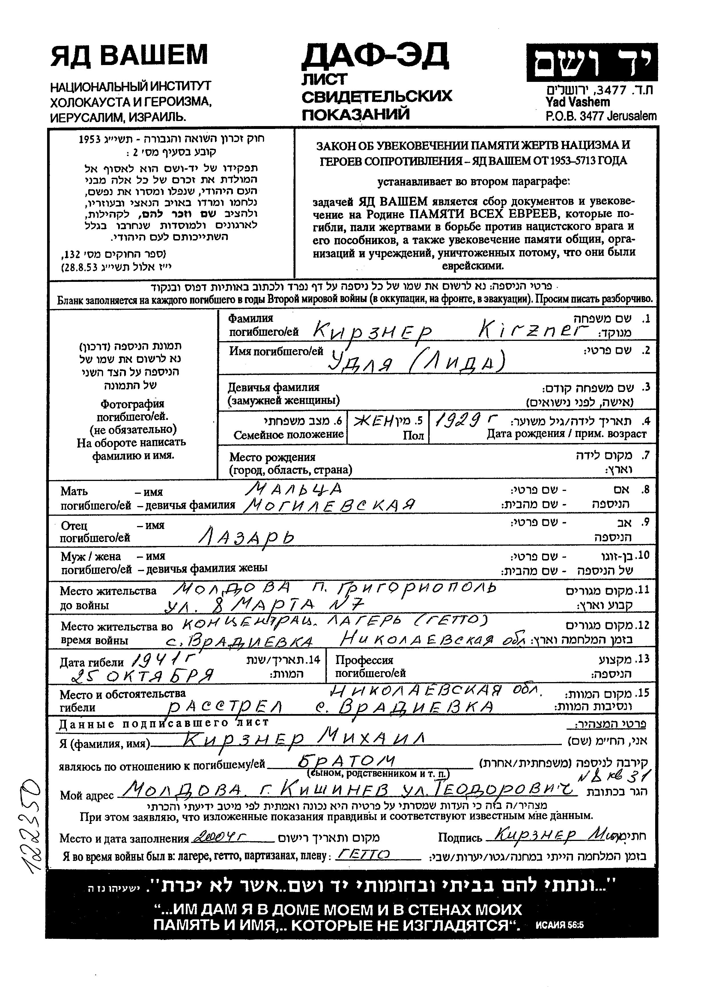 Udlya Lida Kirzner wurde im Jahr 1929 geboren. Sie war die Tochter von Lazar und Maltza, geb. Mogilevskaya. Sie war Kind. Vor dem Zweiten Weltkrieg lebte sie in Grigoriopol, Ukraine (UdSSR). Während des Krieges war sie in Vradiyevka, Ukraine (UdSSR).