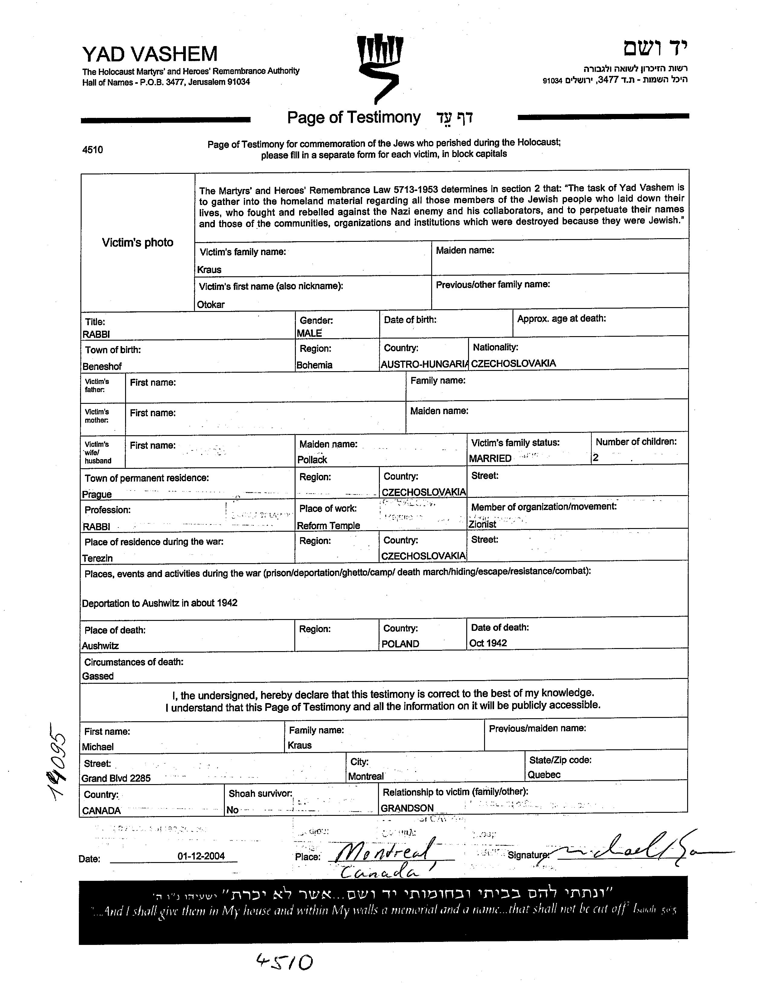 Rabbiner Otokar Kraus wurde in Benesov, Tschechoslowakei geboren. Er war Verheiratet. Vor dem Zweiten Weltkrieg lebte er in Prague, Tschechoslowakei. Während des Krieges war er in Terezin, Tschechoslowakei.