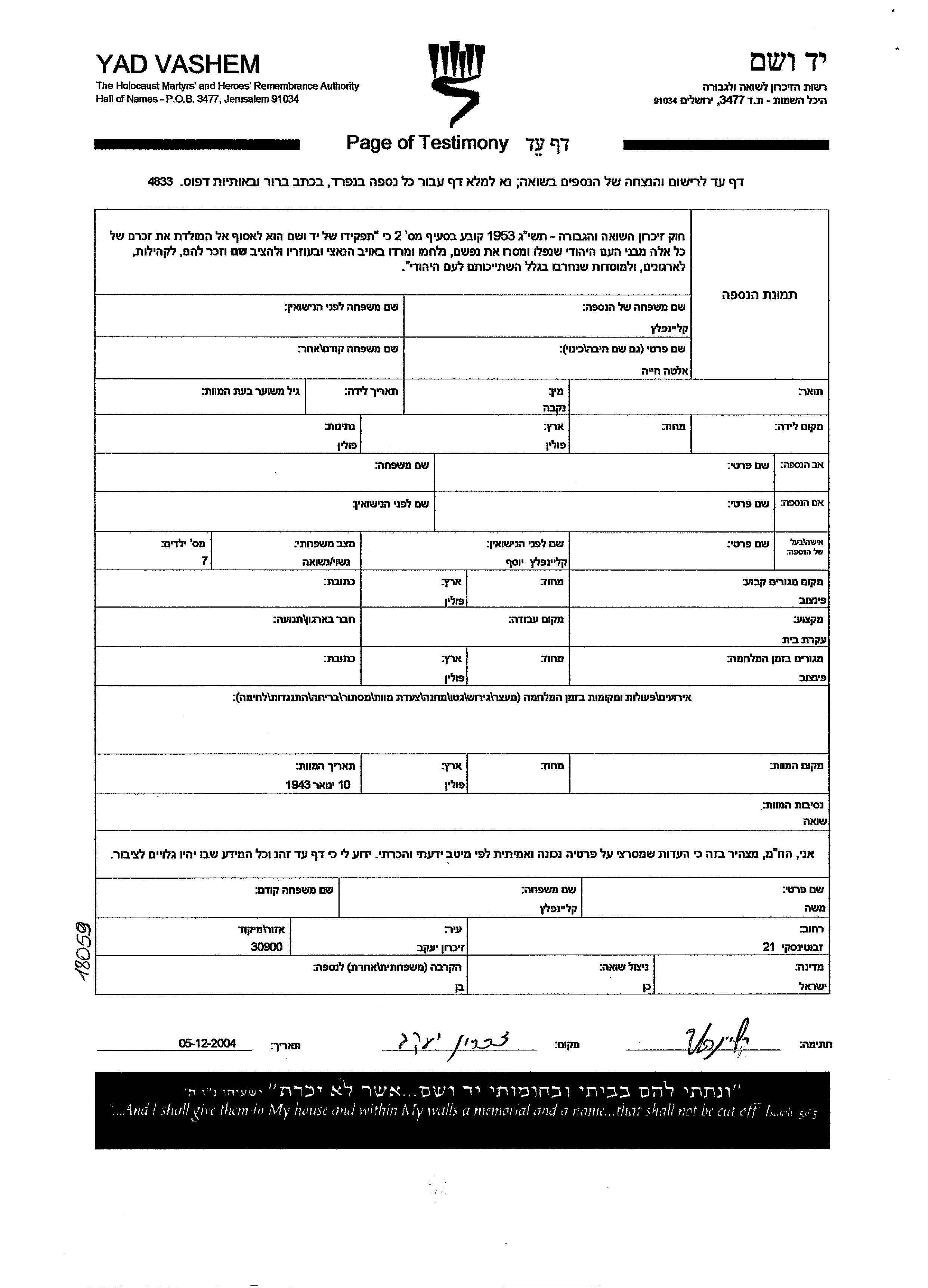 Khaia Alte Kleinplatz wurde in Polen geboren. Sie war mit Yosef, geb. Kleinplatz Verheiratet. Vor dem Zweiten Weltkrieg lebte sie in Pinczow, Polen. Während des Krieges war sie in Pinczow, Polen.