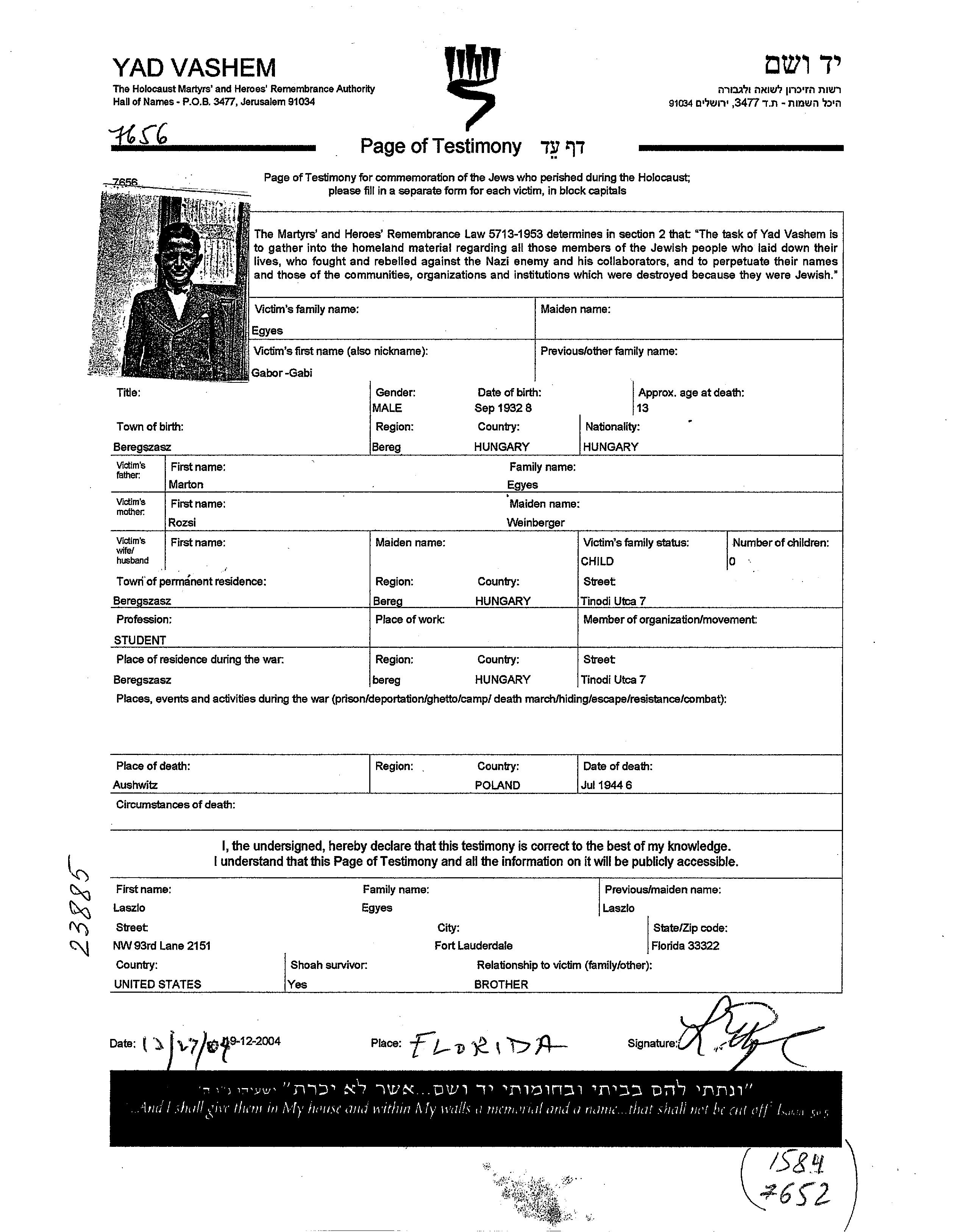 Gabi Egyes wurde im Jahr 1932 in Beregszasz, Tschechoslowakei geboren. Er war der Sohn von Marton und Rozsi, geb. Weinberger. Er war Kind. Vor dem Zweiten Weltkrieg lebte er in Beregszasz, Tschechoslowakei. Während des Krieges war er in Beregszasz, Tschechoslowakei.